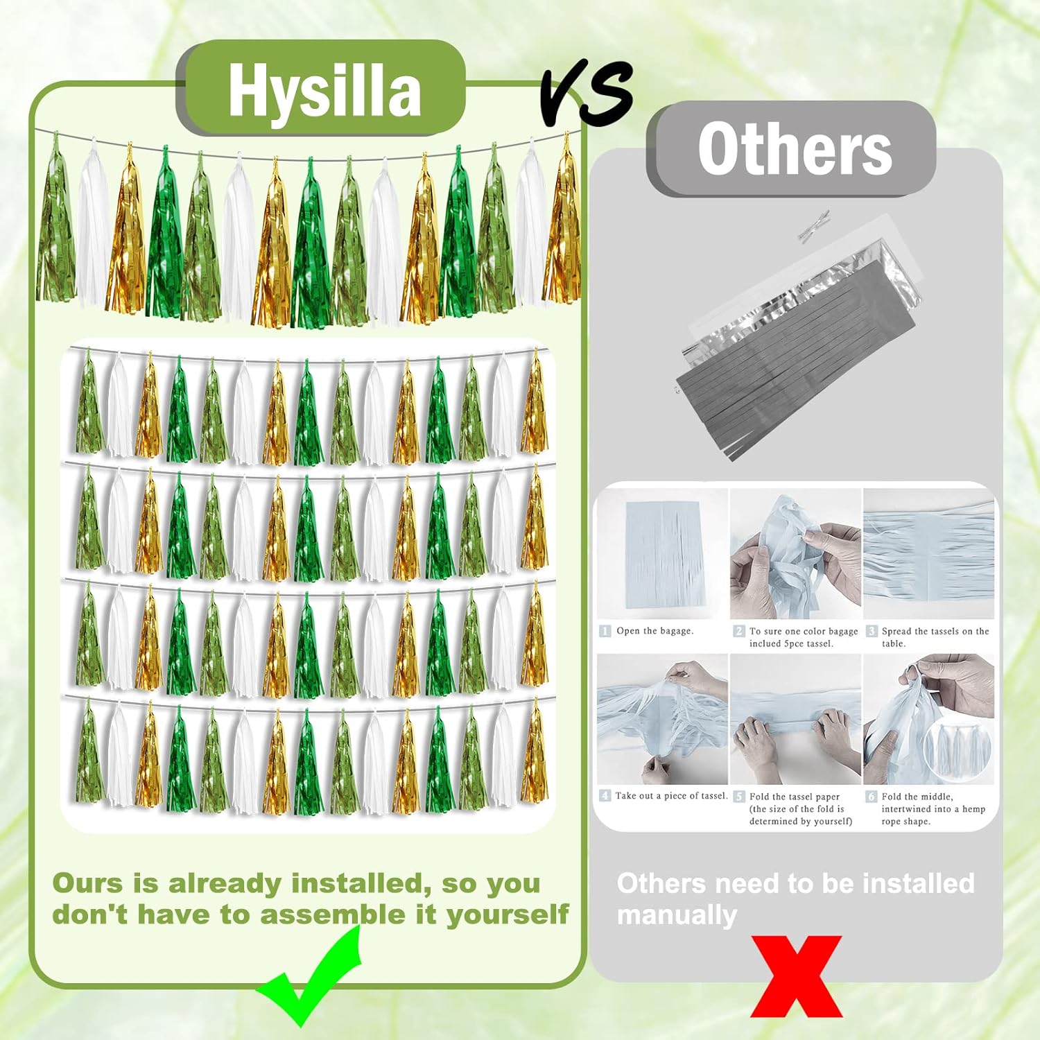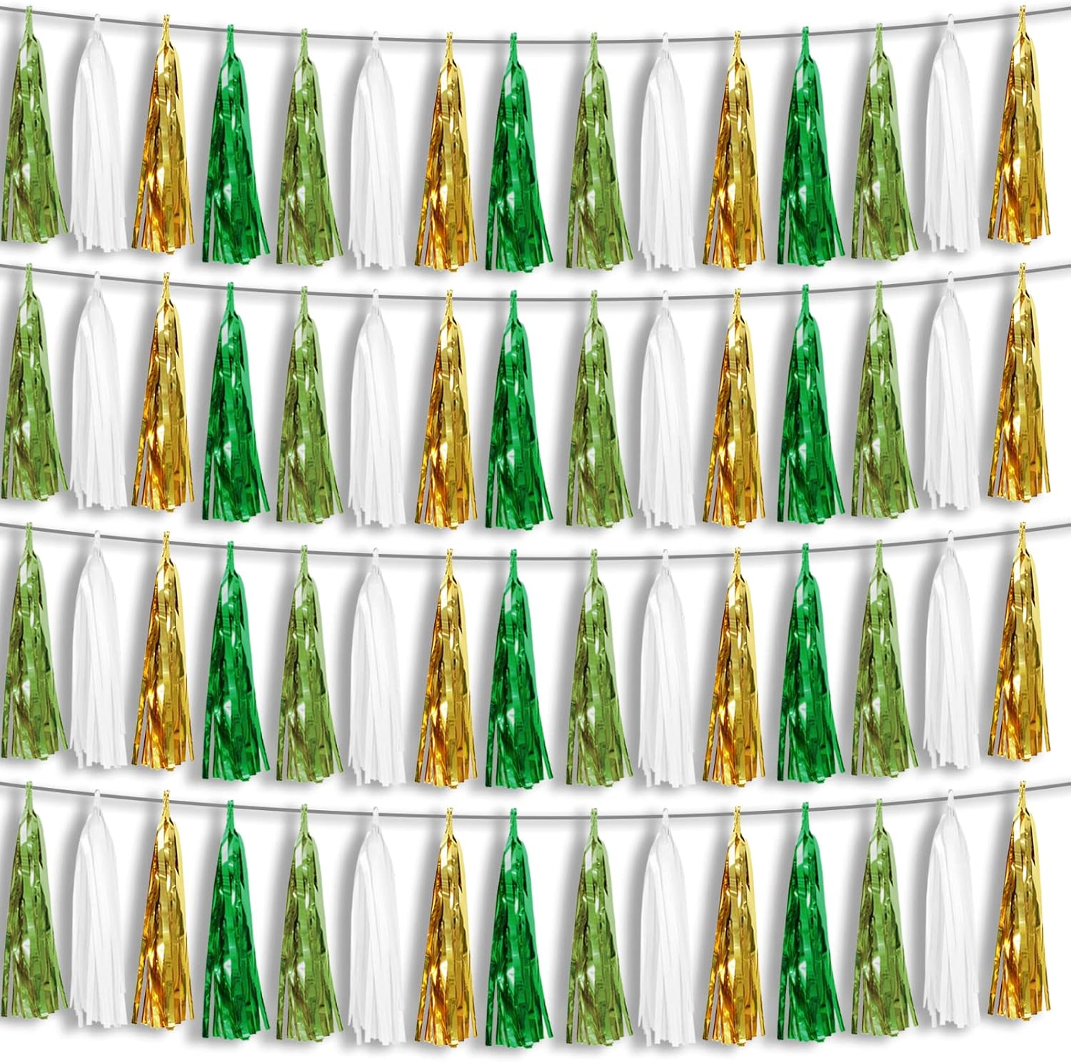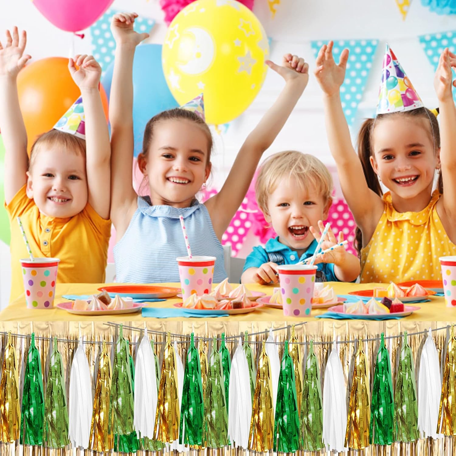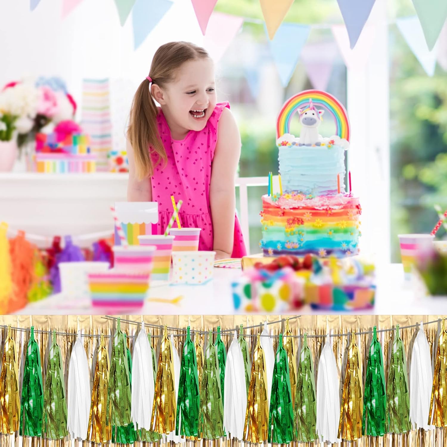 • 【Light Green White Gold Green Party Supplies Set】: The total length of the Light Green White Gold Green birthday tassels banner is 39.3 feet, divided into 4 strips, each 9.8 feet long. Each banner contains 15 tassels, and each tassel measures 14 inches, for birthday decorations many occasions, and so on