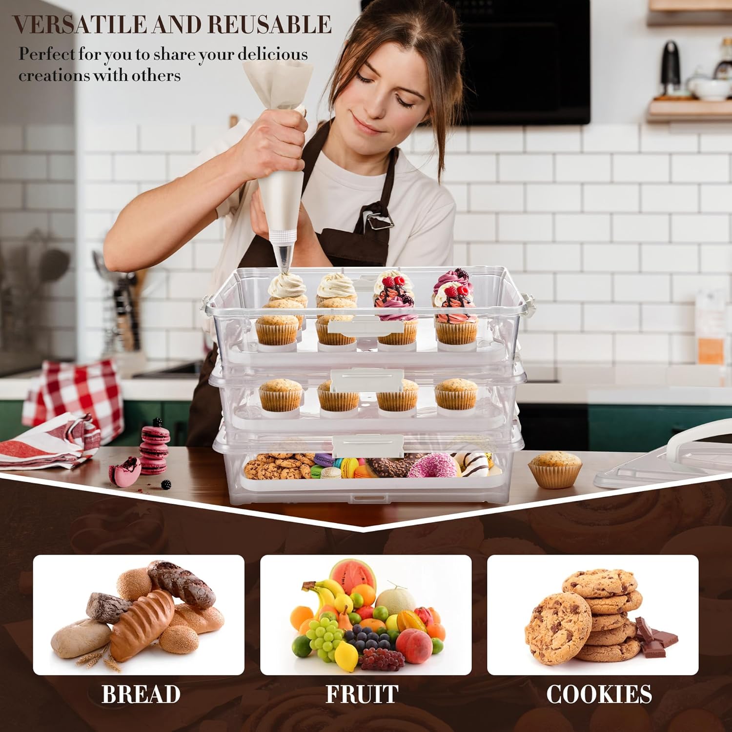 - π§ ARC 3-tiers Cupcake Carrier made of safe and durable plastic that is BPA-free, safe for freezer and resists odors in the refrigerator.