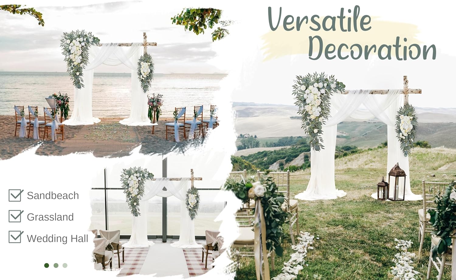 - PAKEAGE LIST: 1 x Large Corner Flower Swag of 32 "W x 40 "H + 1 x Large Tie-Back Flower of 14 "W x 32 "H + 2 x Hanging Sheer Drapes of 315 x 28 inch + 6 x White Zip Straps of 17.7 inch + 1 x Instruction Card + 1 x Glue Stick (Not include wood arch stand)