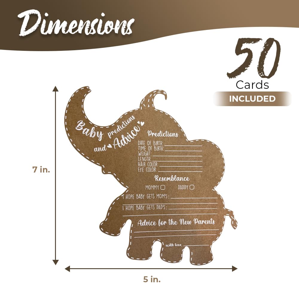 - Our elephant-shaped prediction and advice cards come conveniently packaged in sets of 50, making them a convenient addition to any baby shower. With measurements of 5.25" w x 6" h, these cards are the perfect size for guests to fill out, and they come packaged in shrink wrap with a sticker for easy gifting.