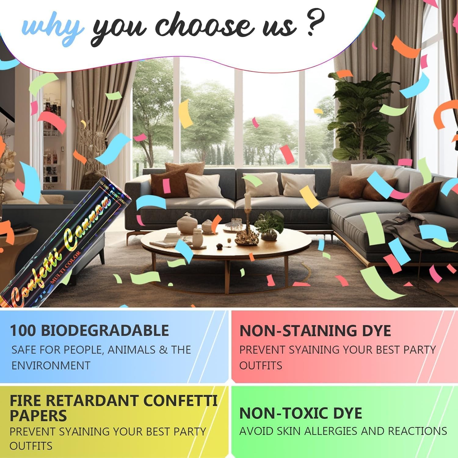 - SAFE & EASY TO USE: Our confetti cannon kit contains multicolor confetti are safe non-toxic, and made with Biodegradable confetti papers.12-inch confetti poppers shoot 10 to 15 feet in the air and color party poppers confetti shooters work well indoors and outdoors easy to clean and 100% safety, you and your guests can enjoy confetti cannon for your celebrations party.