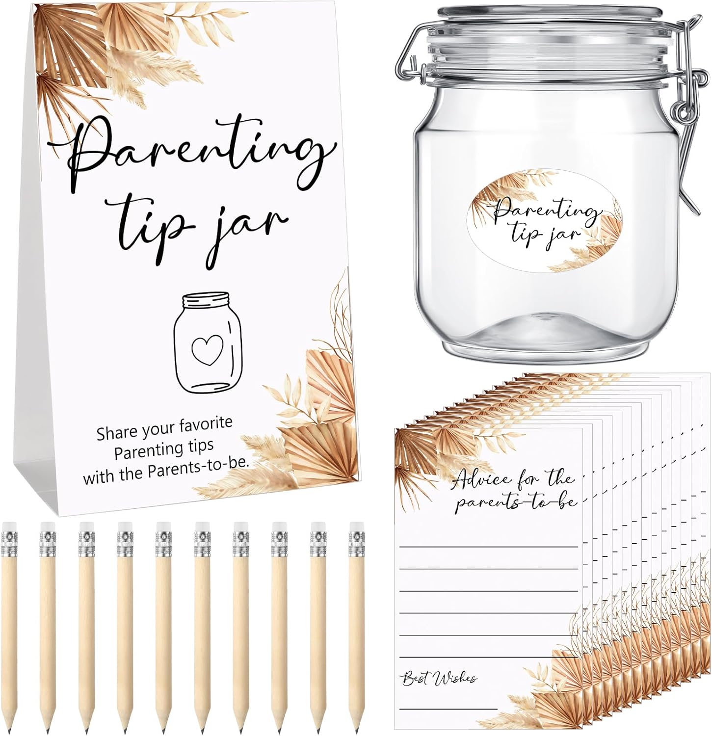 - Baby Shower Cards Set: the package contains 1 piece of parenting tip jar sign, 60 pieces of tips cards for the parents to be, 10 pieces of pencils, 2 pieces of cute stickers, and 1 PET bottle, enough quantity and delicate design to meet your use needs