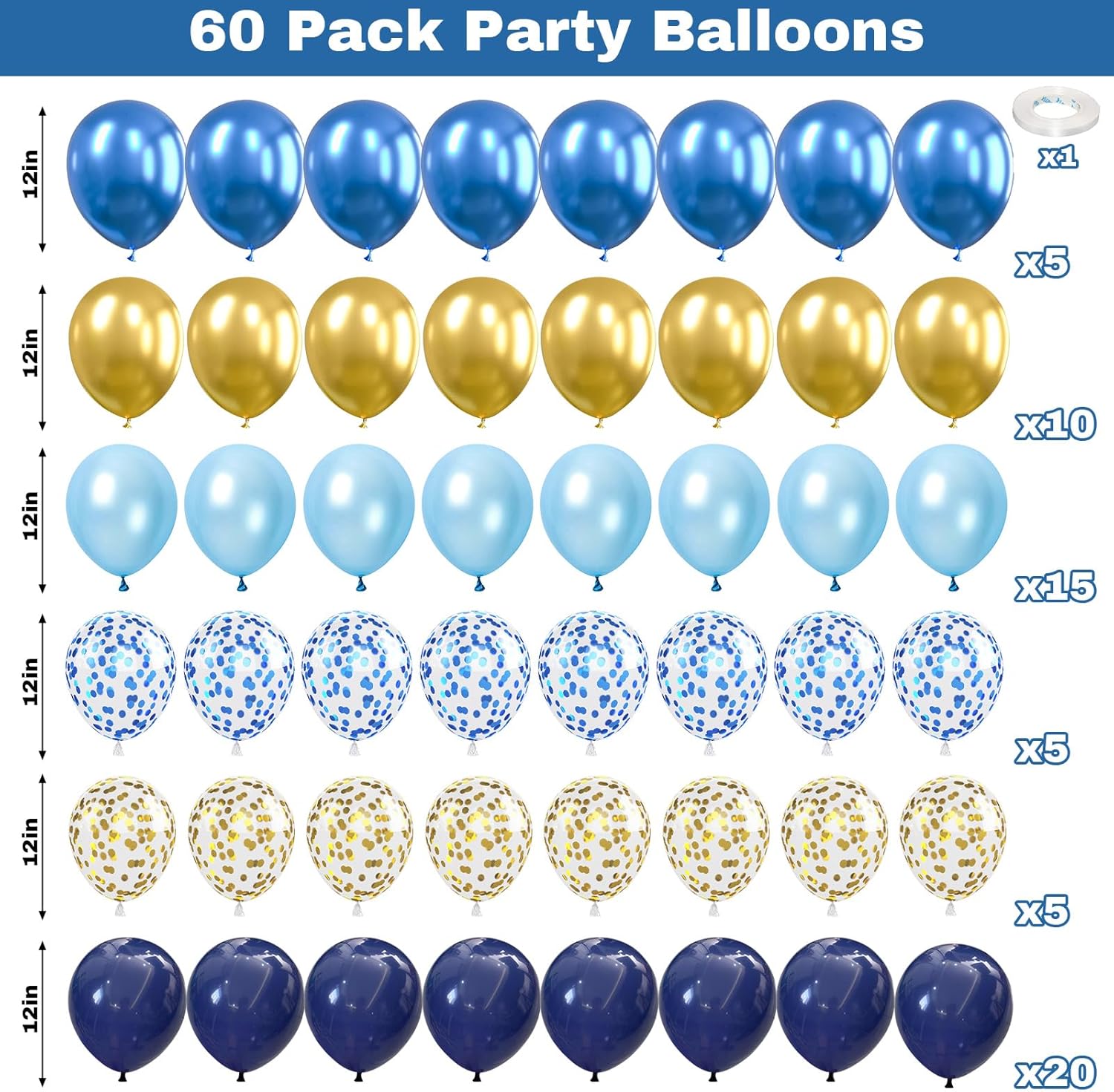 - Included Components : 60Pcs Blue and Gold Balloons, 1pc balloon ribbon