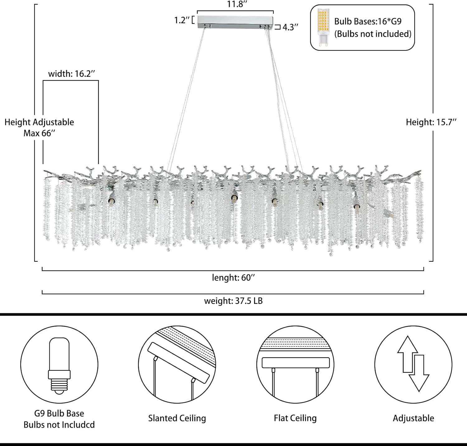 - 【Chandelier Specifications】Size: 60“ x 16.2” x 15.7", weight: 37.5LB, the chandelier cable is 0-66 inches adjustable. Chandelier frame is made of high quality aluminum alloy, each branch is detachable and assembled easily. Simply hang the crystals on the branch