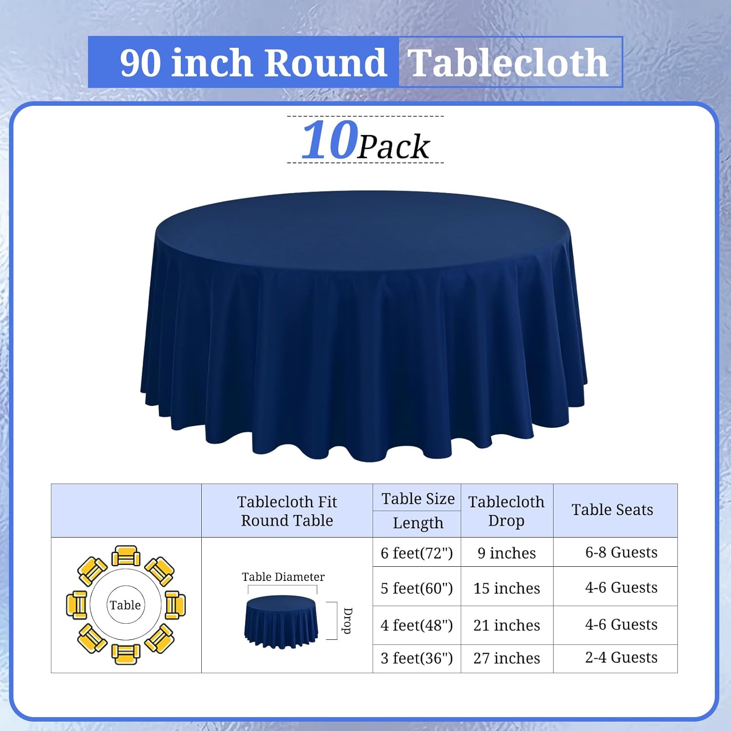 10 Pack Navy Blue 90 Inch Round Polyester Tablecloths - Wrinkle & Stain Resistant, Perfect for Weddings, Parties & Everyday Use