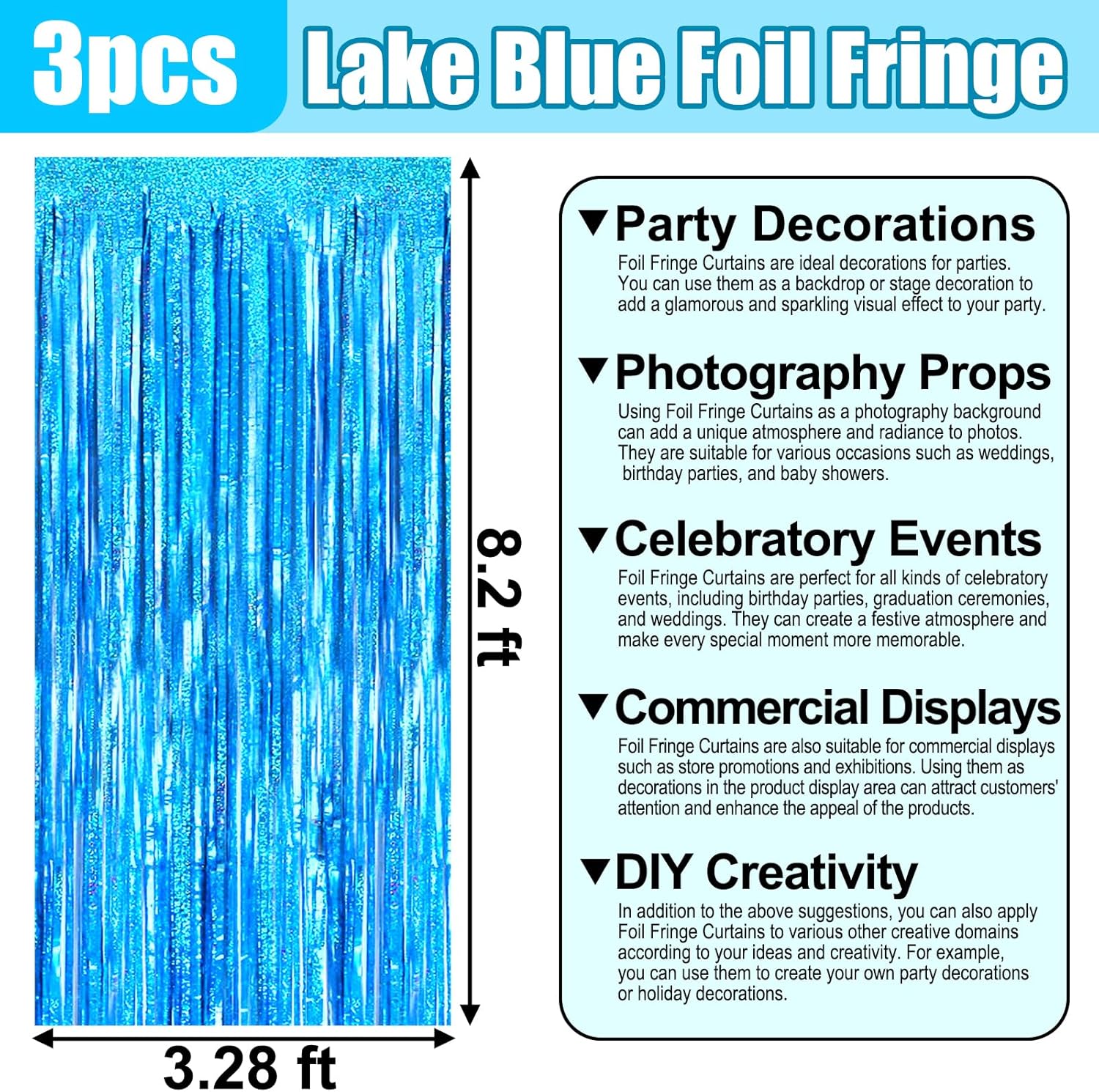3 Pack Lake Blue Foil Fringe Curtain Backdrop, 3.28Ft x 8.2Ft Metallic Tinsel Foil Fringe Streamer Curtains for Photo Booth, Mother's Day, Easter, Birthday, Wedding Party Decorations