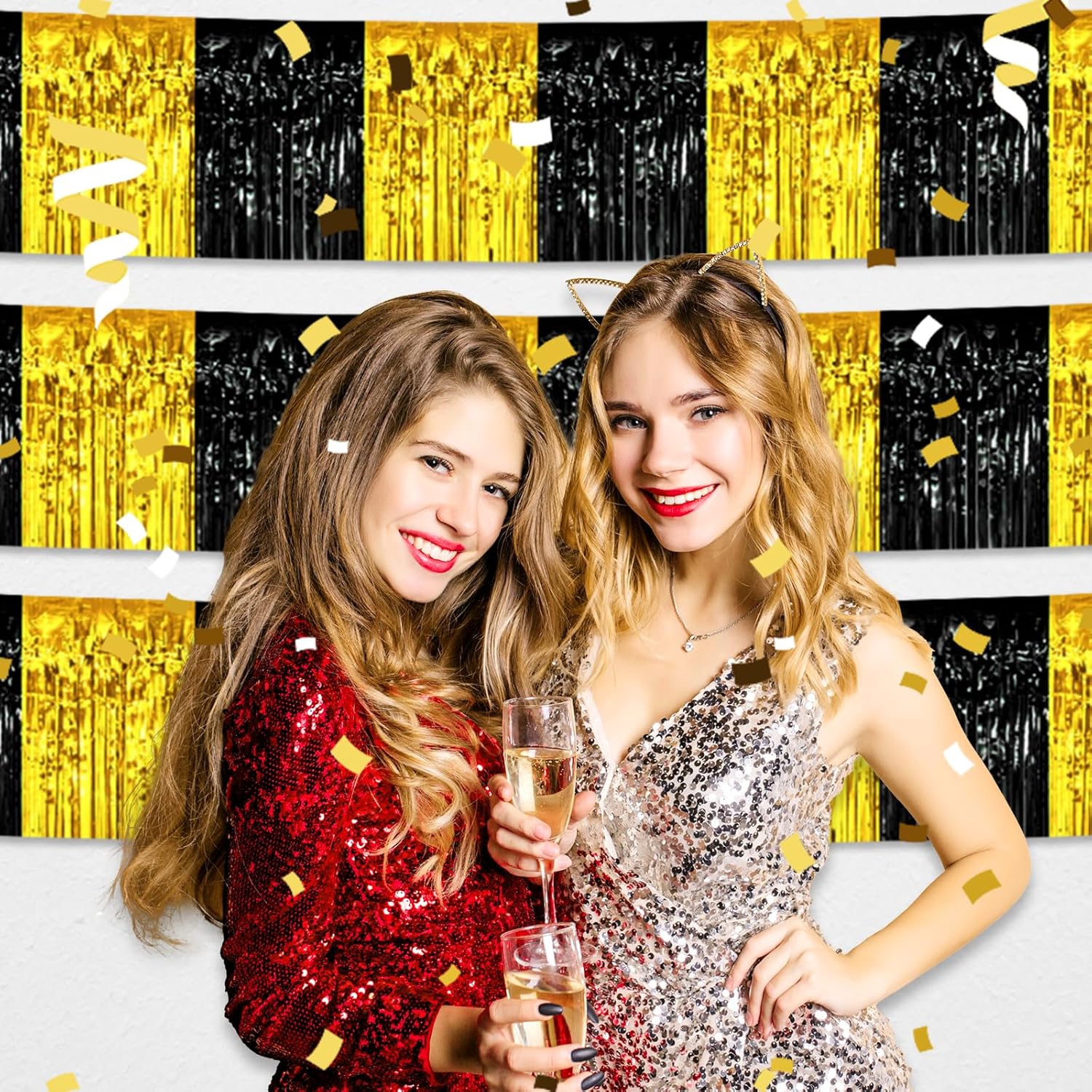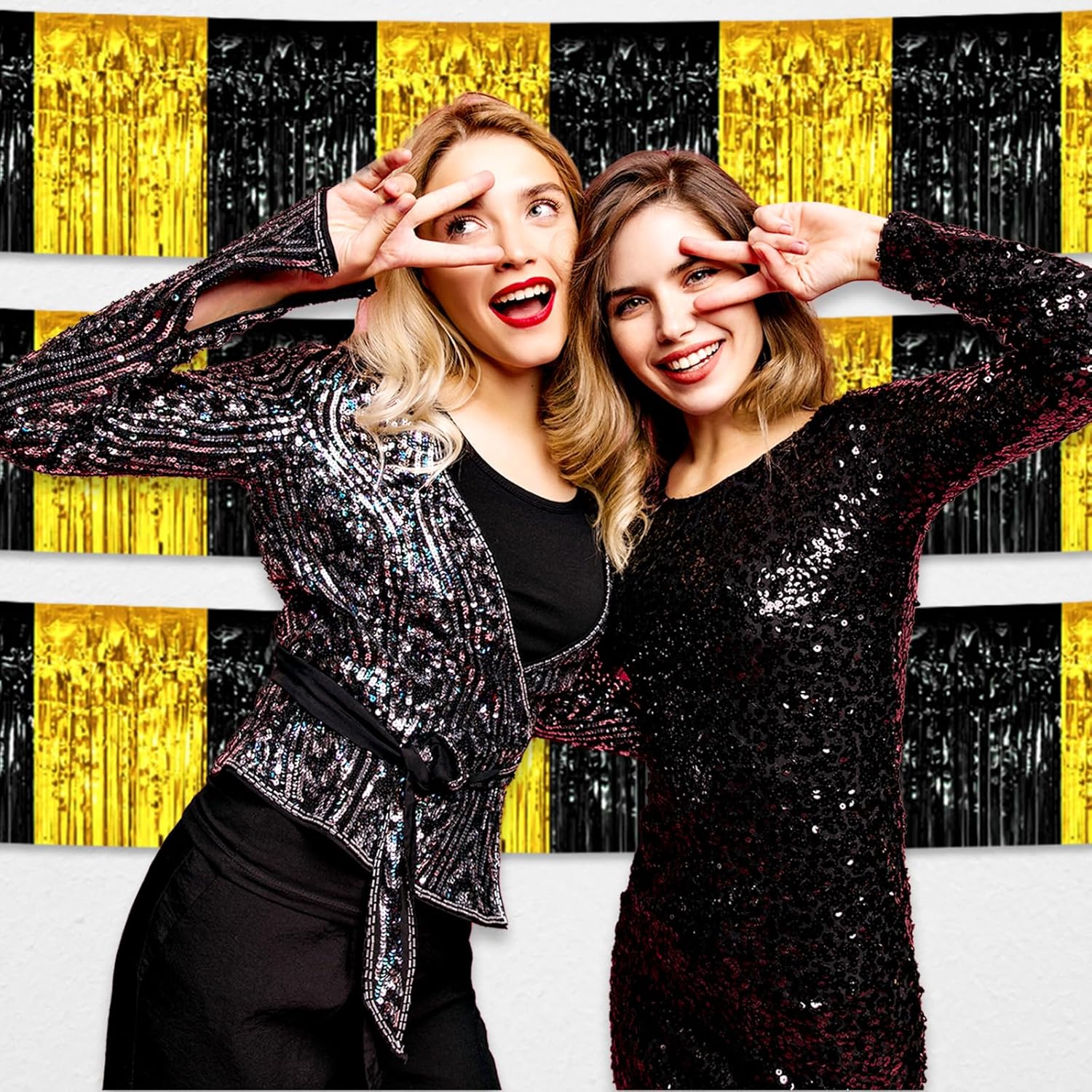 4 Pack 10 Feet Black Gold Foil Fringe Garland Metallic Tinsel Streamers Banner Wall Hanging Curtain Backdrop for Parade Floats, Wedding, Graduate, Mother's Day, Birthday Party Decoration
