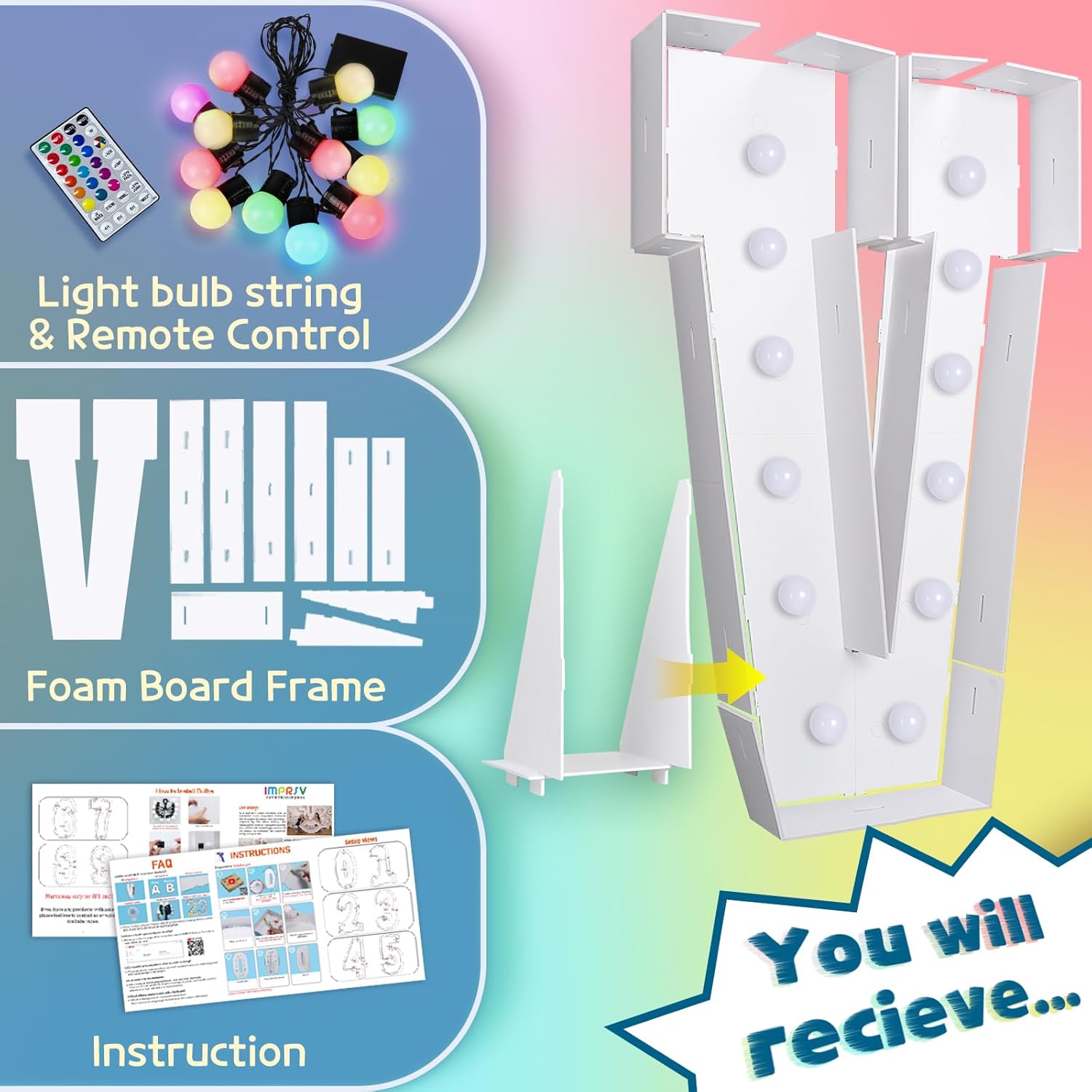 imprsv 4FT Colorful Marquee Light Up Letters V, 18 Colors Large Light up Letters Alphabet Sign with Remote, Large Marry Me Sign, Birthday Party Decorations Baby Shower Anniversary Wedding Decoration