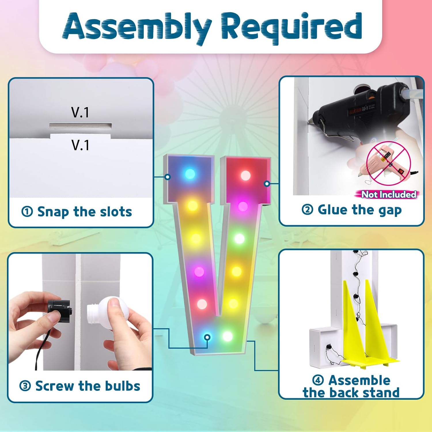 - Assembly Required. To assemble the light up numbers and letters, a hot glue gun is necessary. We have conveniently pre-cut the numbers into several pieces for your convenience. Simply consult the included instruction manual to easily assemble the impressive 4 ft tall and 3ft tall marquee numbers and letters using a hot glue gun.
