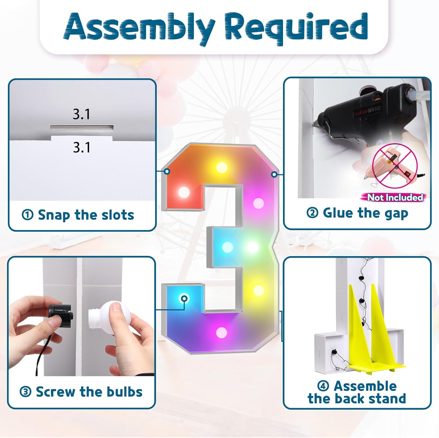 - Assembly Required. To assemble the light up numbers and letters, a hot glue gun is necessary. We have conveniently pre-cut the numbers into several pieces for your convenience. Simply consult the included instruction manual to easily assemble the impressive 4 ft tall and 3ft tall marquee numbers and letters using a hot glue gun.