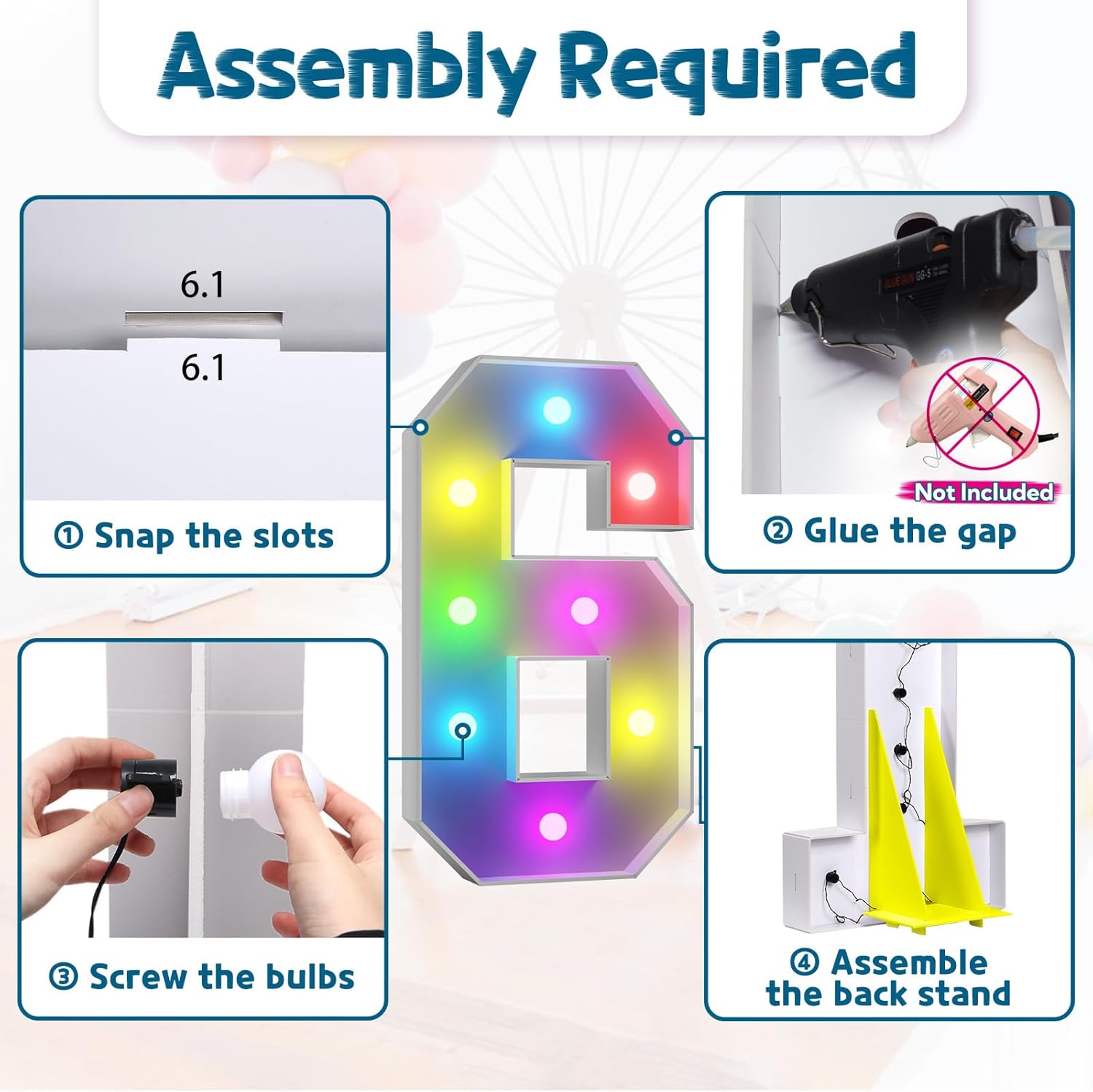 - Assembly Required. To assemble the light up numbers and letters, a hot glue gun is necessary. We have conveniently pre-cut the numbers into several pieces for your convenience. Simply consult the included instruction manual to easily assemble the impressive 4 ft tall and 3ft tall marquee numbers and letters using a hot glue gun.