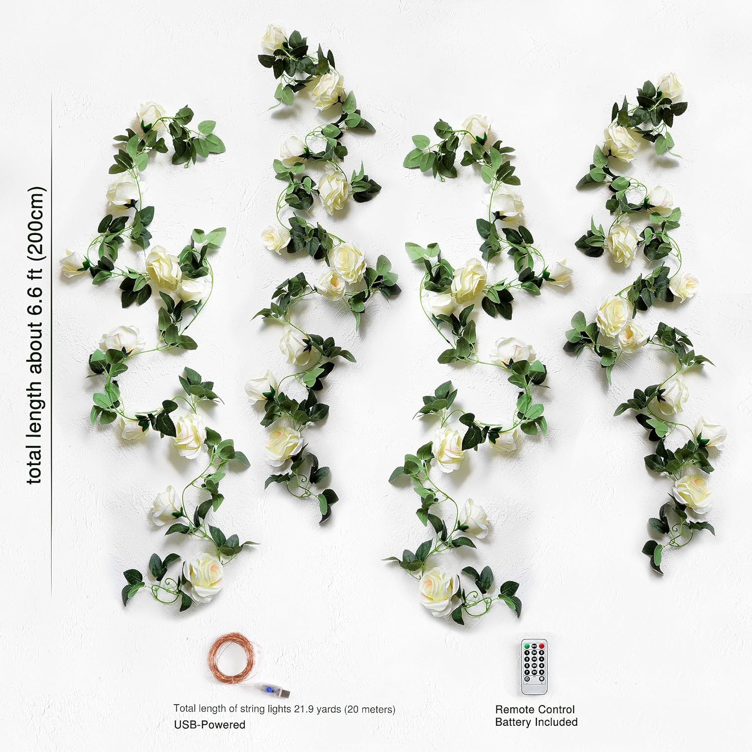 FiveSeasonStuff Product Image 29 Ft 4 Pack Cream White Rose Silk Flower Garland Artificial Flowers Decoration Hanging Floral with 66 feet String Lights