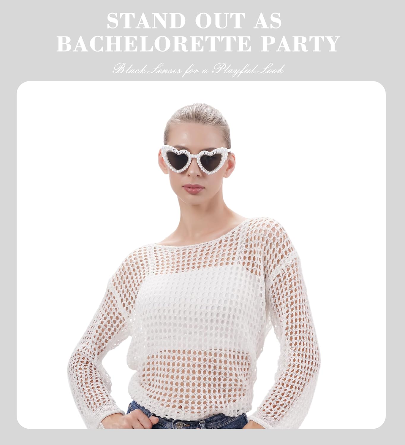 - ELEGANT BRIDE THEME DESIGN: These white heart sunglasses bachelorette party are adorned with dazzling rhinestone and "BRIDE TO BE" lettering, symbolizing timeless love and happiness. Once you put them on, you'll instantly become the center of attention at bachelorette and bride to be parties. Radiate elegance with these bride sunglasses!