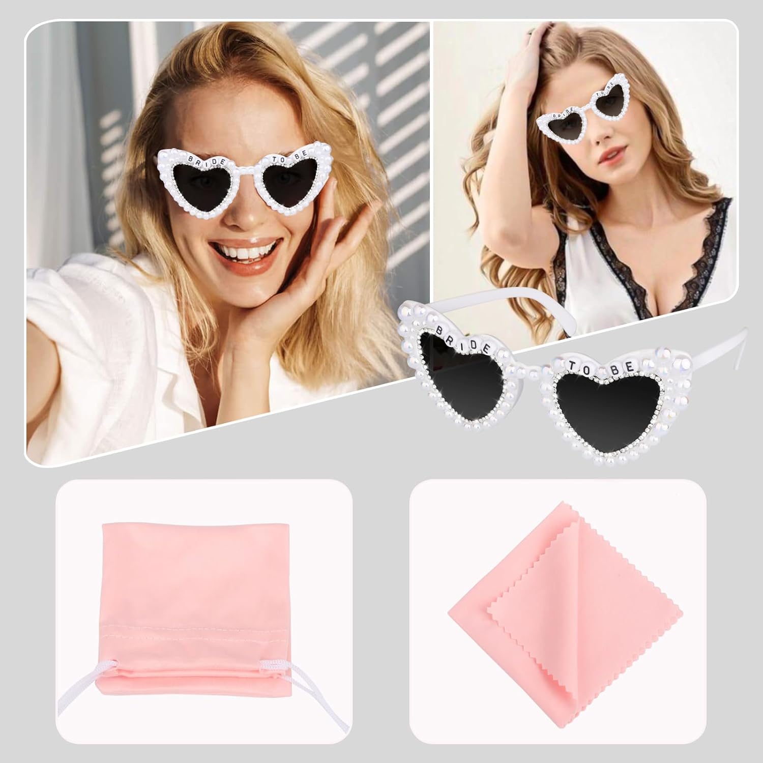 - PRODUCT DETAILS: The package includes 1 heart-shaped bride to be glasses, 1 pink pouch, and 1 pink glasses cloth, making a total of 3 pieces in this set. These accessories are perfect for bachelorette party decorations and can be easily matched with any makeup look of your choice.