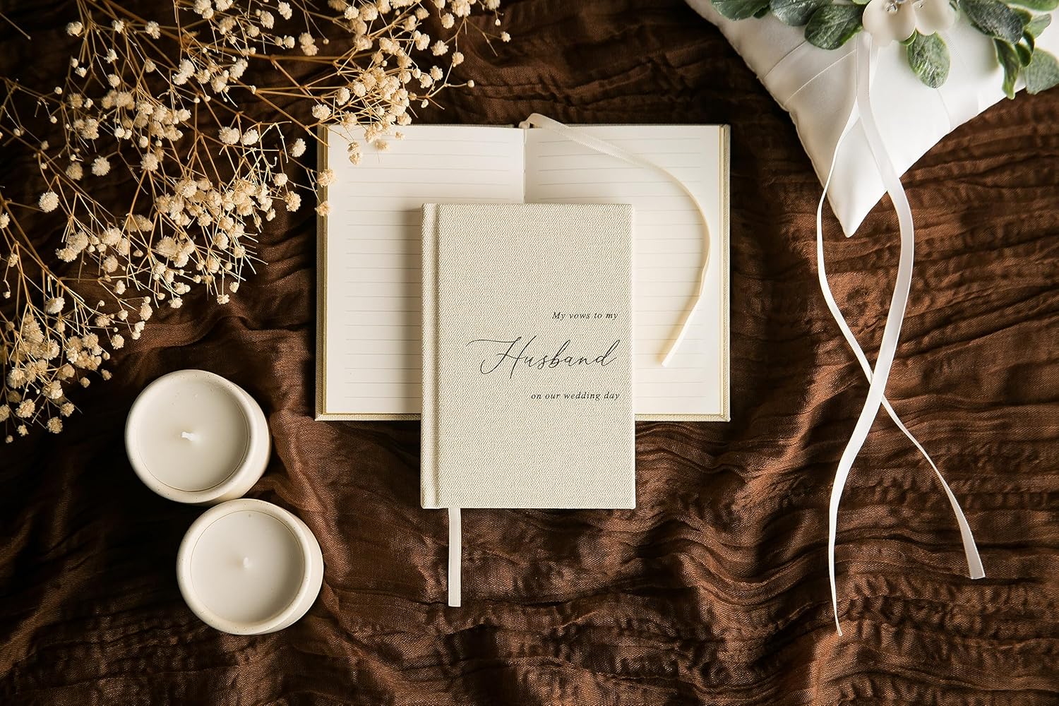 MUUJEE Hard Cover Vow Books (Set of 2) - Cream Canvas Linen Foil Embossed Wedding Ceremony Vow Renewal Speech Books, Couple Gifts for Engagement (To My Husband/Wife)