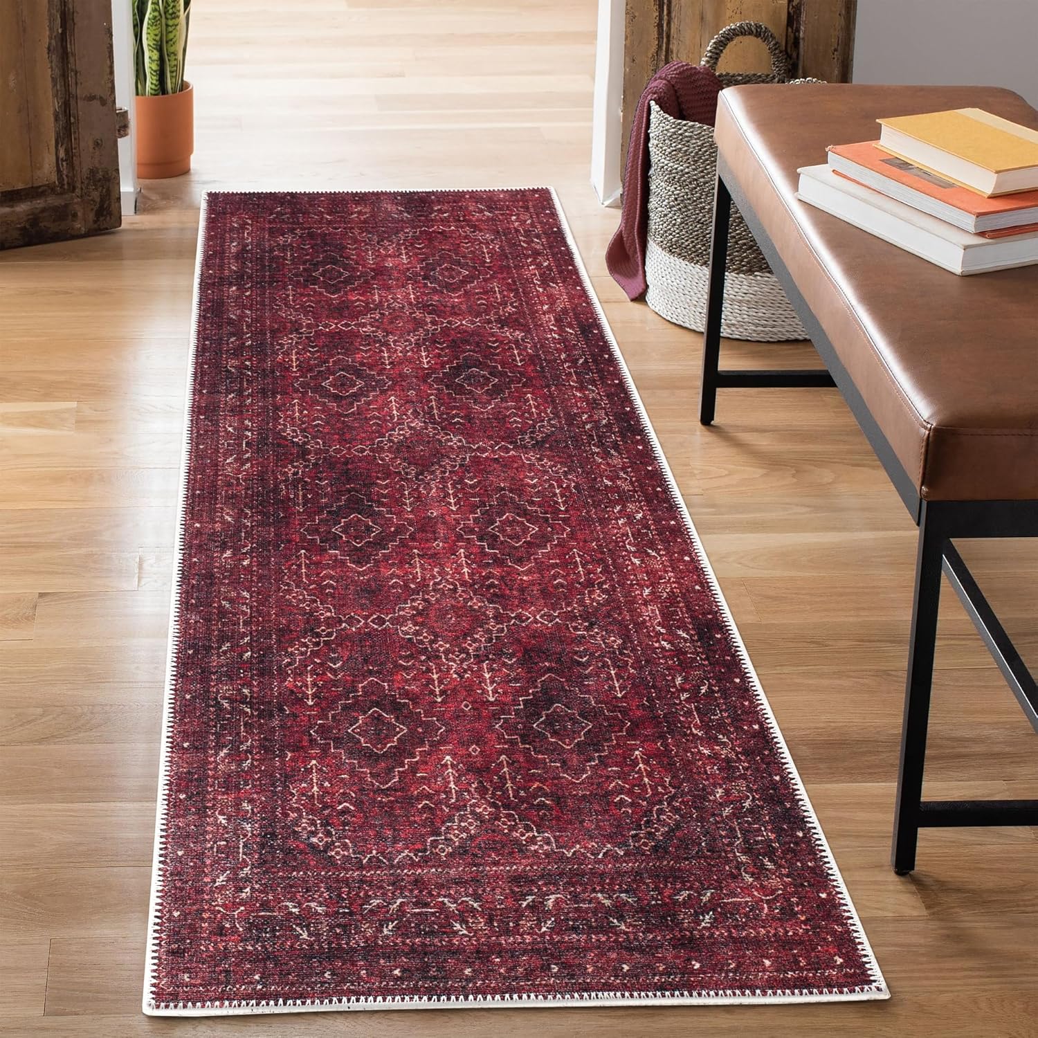 Bloom Rugs Washable Non-Slip 10 ft Runner - Dark Red Traditional Bordered Runner for Entryway, Hallway, Bathroom, and Kitchen - Exact Size: 2.5' x 10'