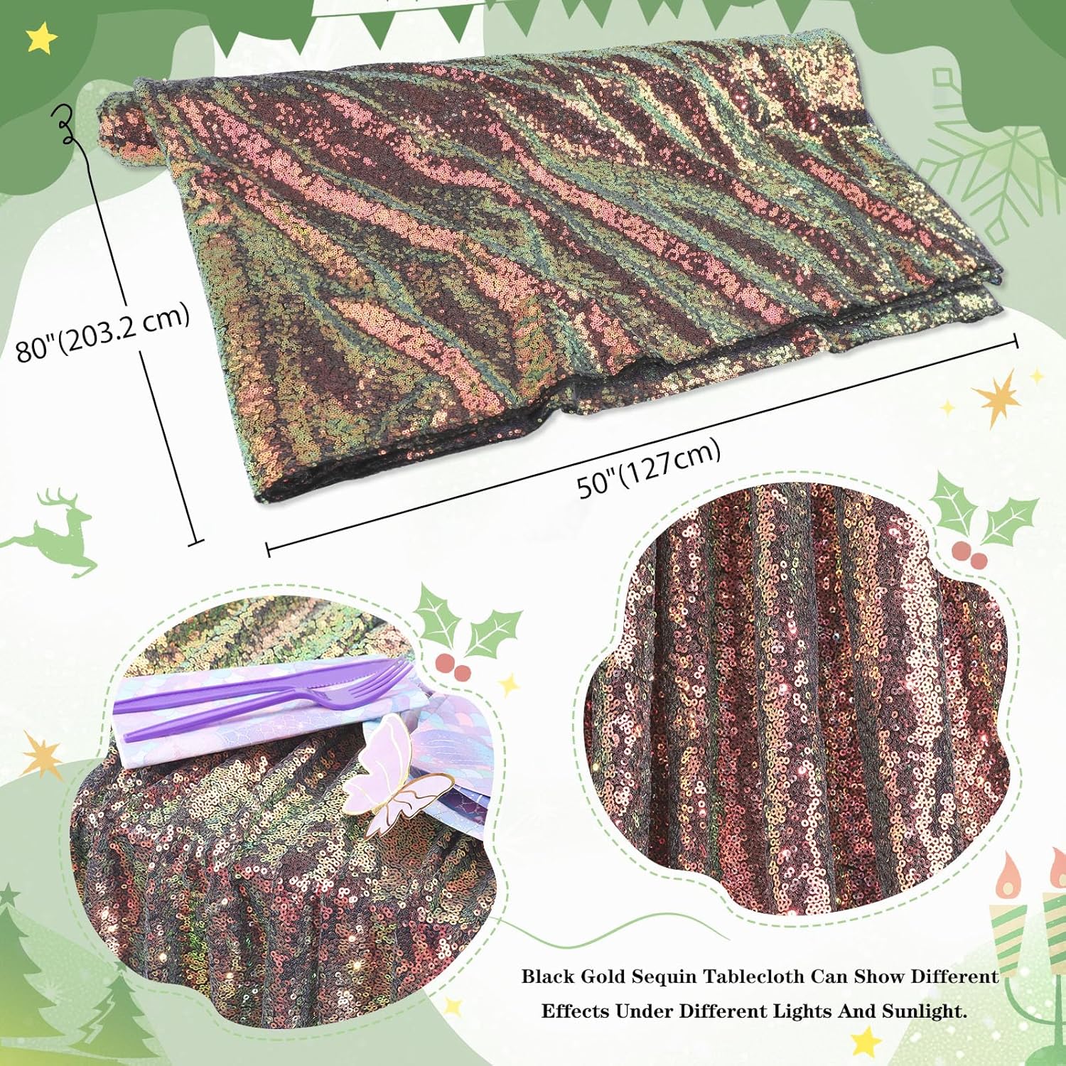 - Black and Gold Sequin Tablecloth Size:1 packs of Black and Gold sequin tablecloth, the size of the Black and Gold tablecloth is 50 W by 80 βL inch. It's long enough to fit any round, rectangle or square table.