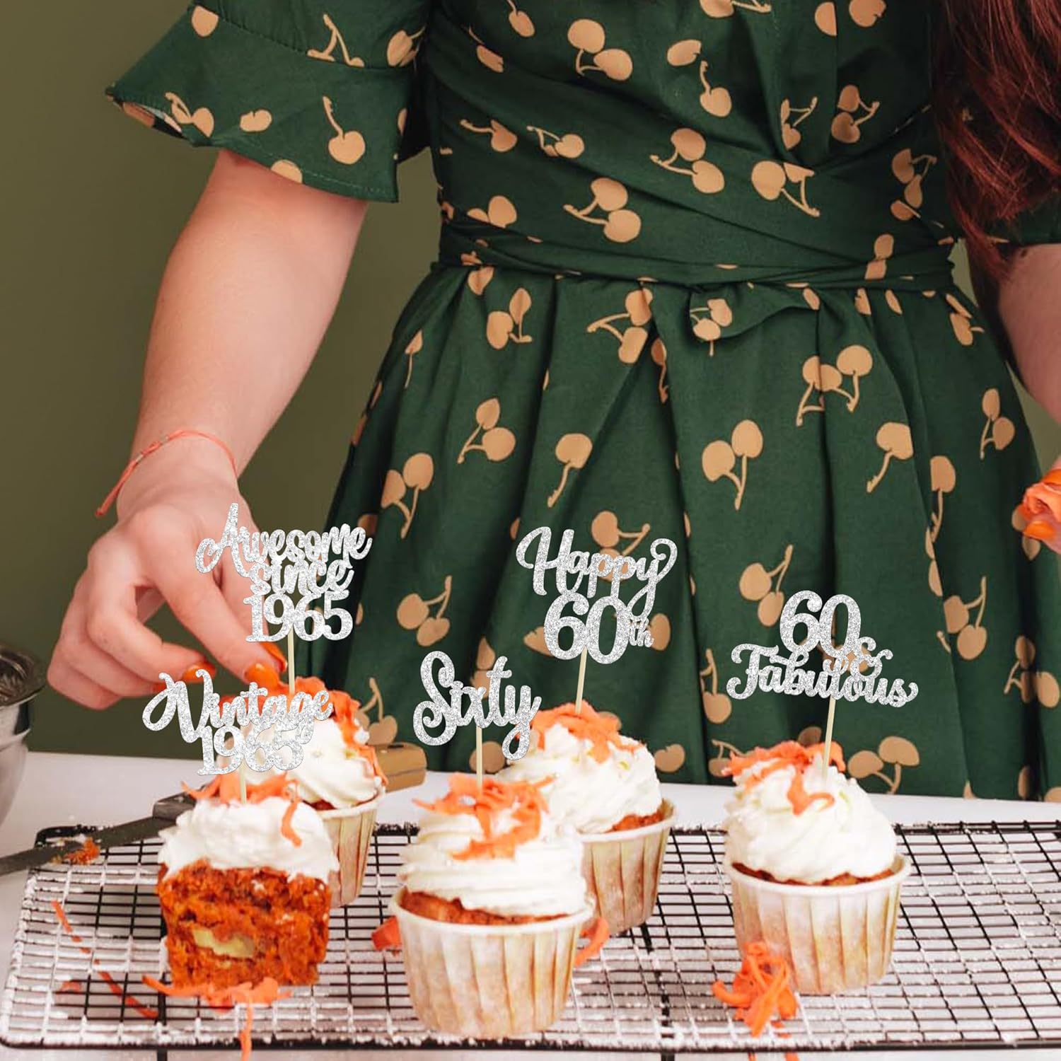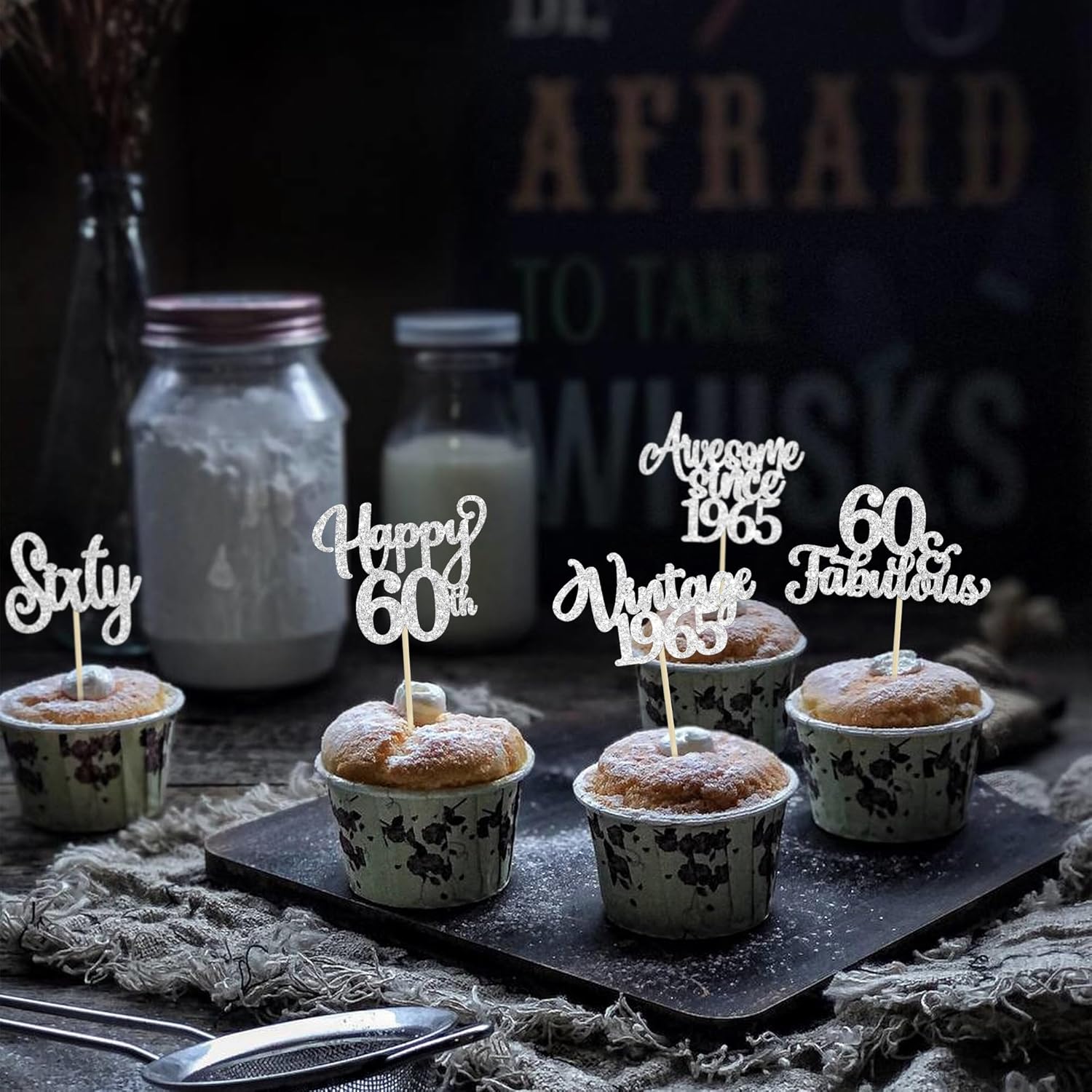 30Pcs Happy 60th Birthday Cupcake Toppers Glitter Sixty Vintage 1965 Cupcake Picks Cheers to 60 Fabulous Cake Decorations for 60th Birthday Wedding Anniversary Party Supplies Silver