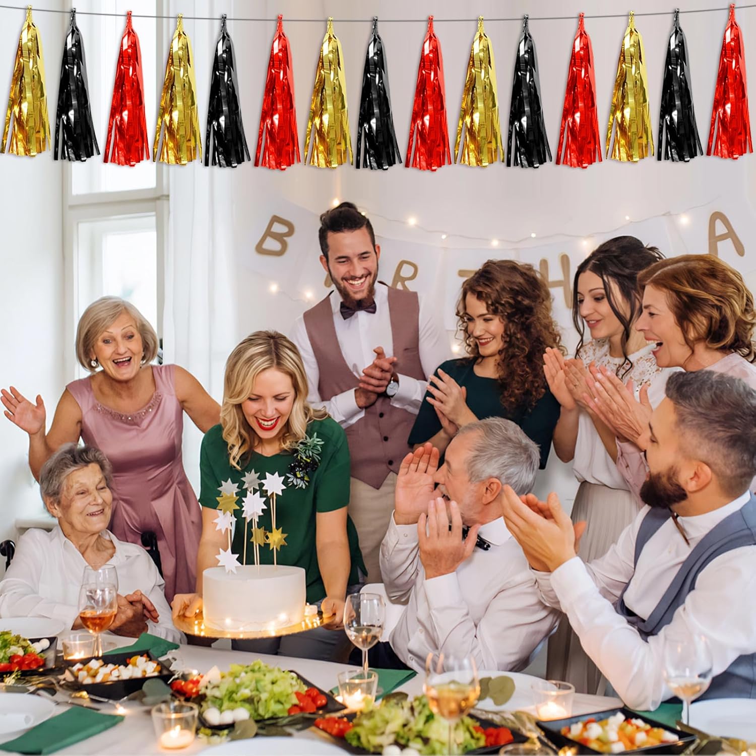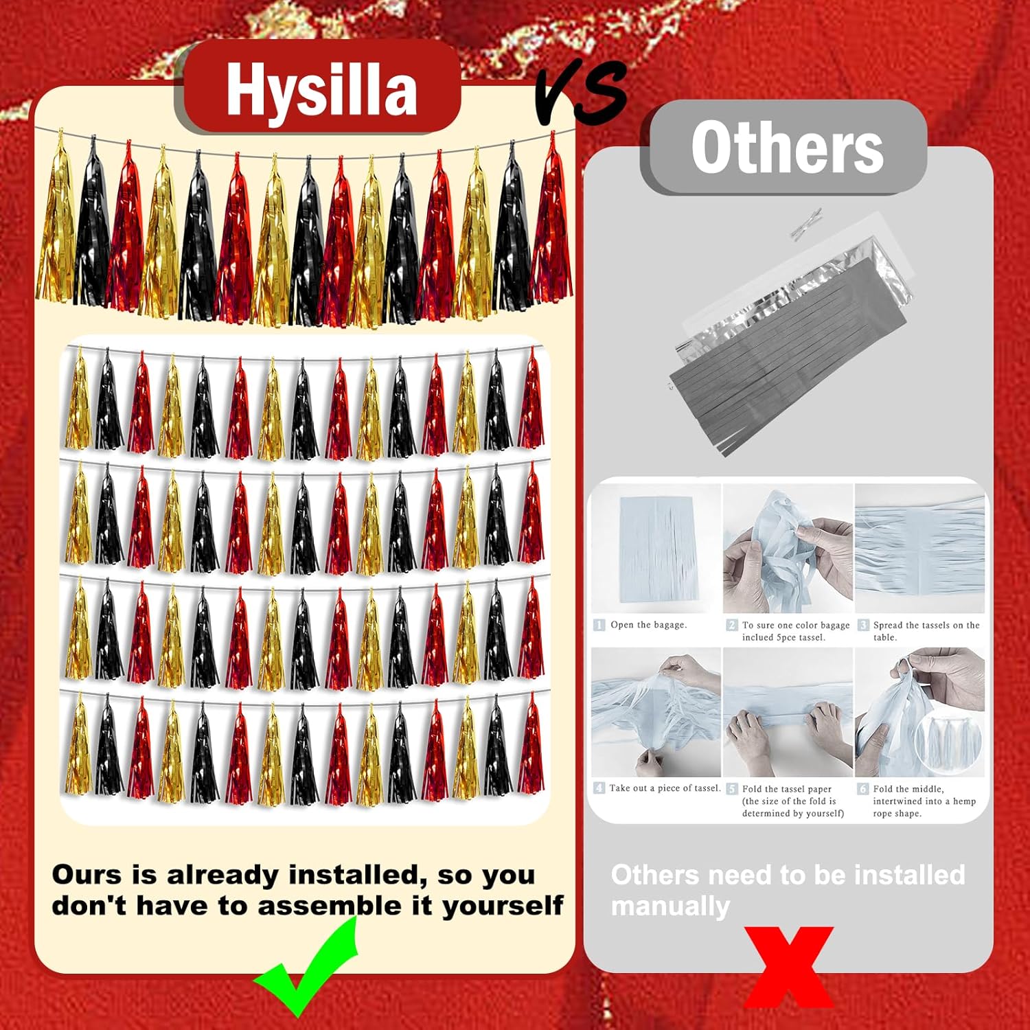 - 【Black Red Gold Party Supplies Set】: The total length of the black red gold birthday tassels banner is 78.7 feet 120tassels, divided into 8 strips, each 9.8 feet long. Each banner contains 15 tassels, and each tassel measures 14 inches, for birthday decorations many occasions, and so on