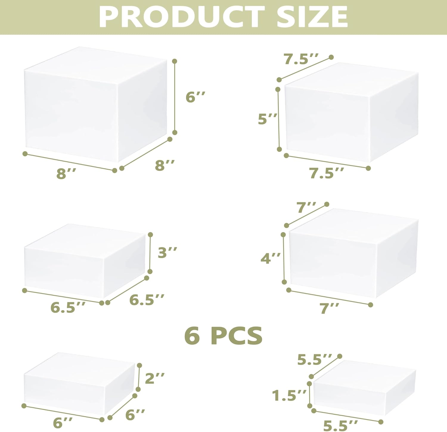 - 6 Various Sizes: Please check measurements in pic3 before purchasing. Our array of acrylic display boxes offers versatility and practicality, available in six distinct sizes:5.5",6",6.5",7",7.5",8". these boxes are designed for nesting and stacking, providing a convenient solution for organizing and showcasing a variety of items.(Please carefully check detail sizes in pictures 3 before you purchase)