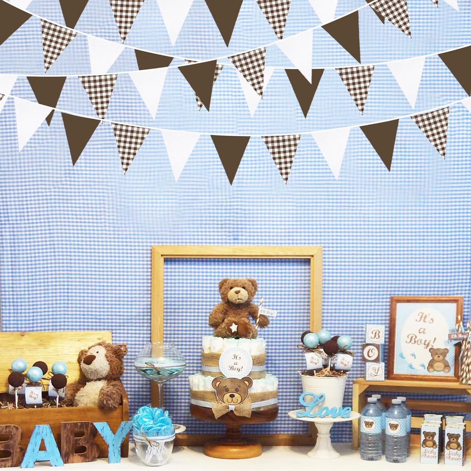 32Ft Coffee Brown Party Decorations Brown Buffalo Plaid Checkered White Triangle Flag Gingham Pennant Bunting Fabric Garland for Woodland Teddy Bear Baby Shower Birthday Home Outdoor Garden Decor