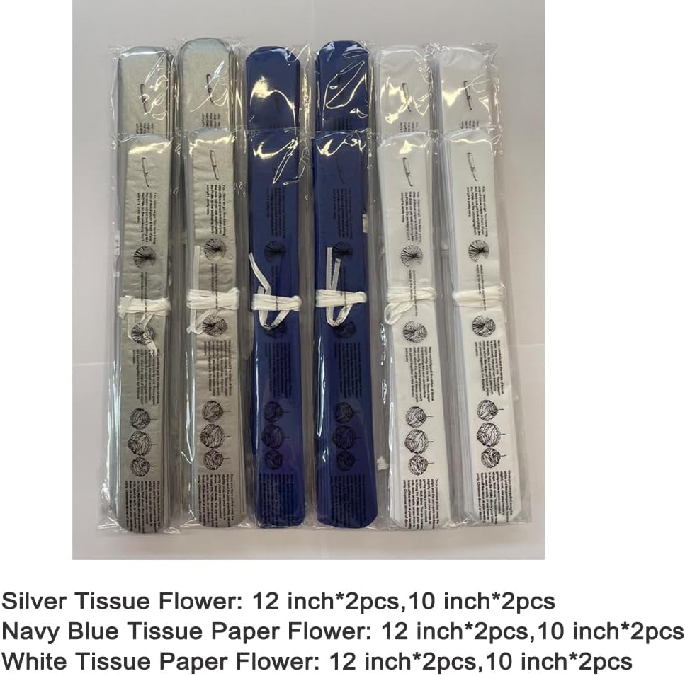 - Tissue Paper Flower Royal Blue and Silver 12pc in 2 sizes,package include silver crafts flower 4pc (2pc in 12'' and 2pc in 10''), royal blue crafts flower 4pc(2pc in 12'' and 2pc in 10''), white crafts flower 4pc(2pc in 12'' and 2pc in 10'')