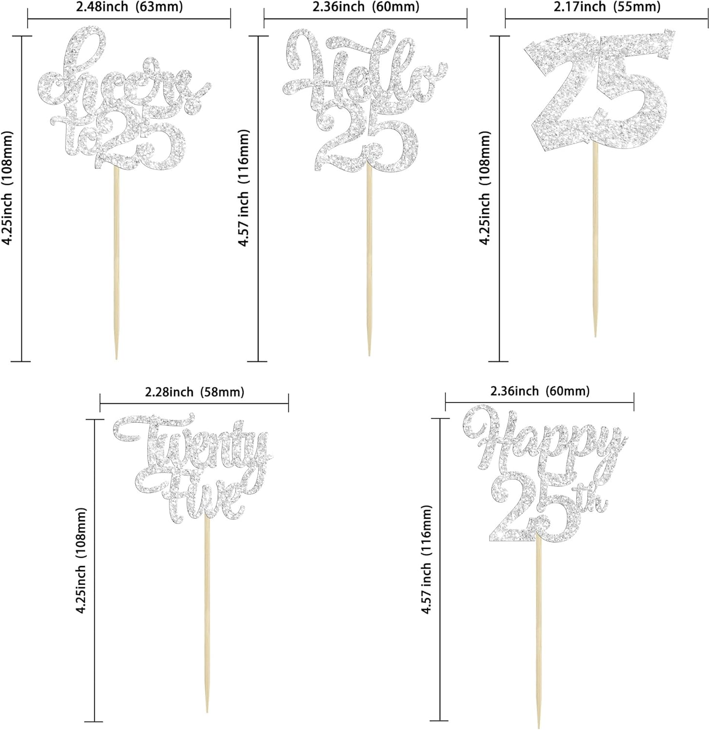 30pcs 25th Birthday Cupcake Toppers - Silver Glitter Cheers to 25 Years Old Cake Decorations for 25th Birthday Anniversary Party Supplies
