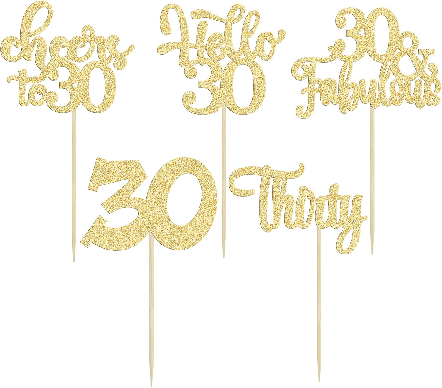 30Pcs Happy 30th Birthday Cupcake Toppers Gold Glitter Thirty Cheers to 30 Birthday Cupcake Picks for Happy 30th Birthday Anniversary Party Cake Decorations Supplies