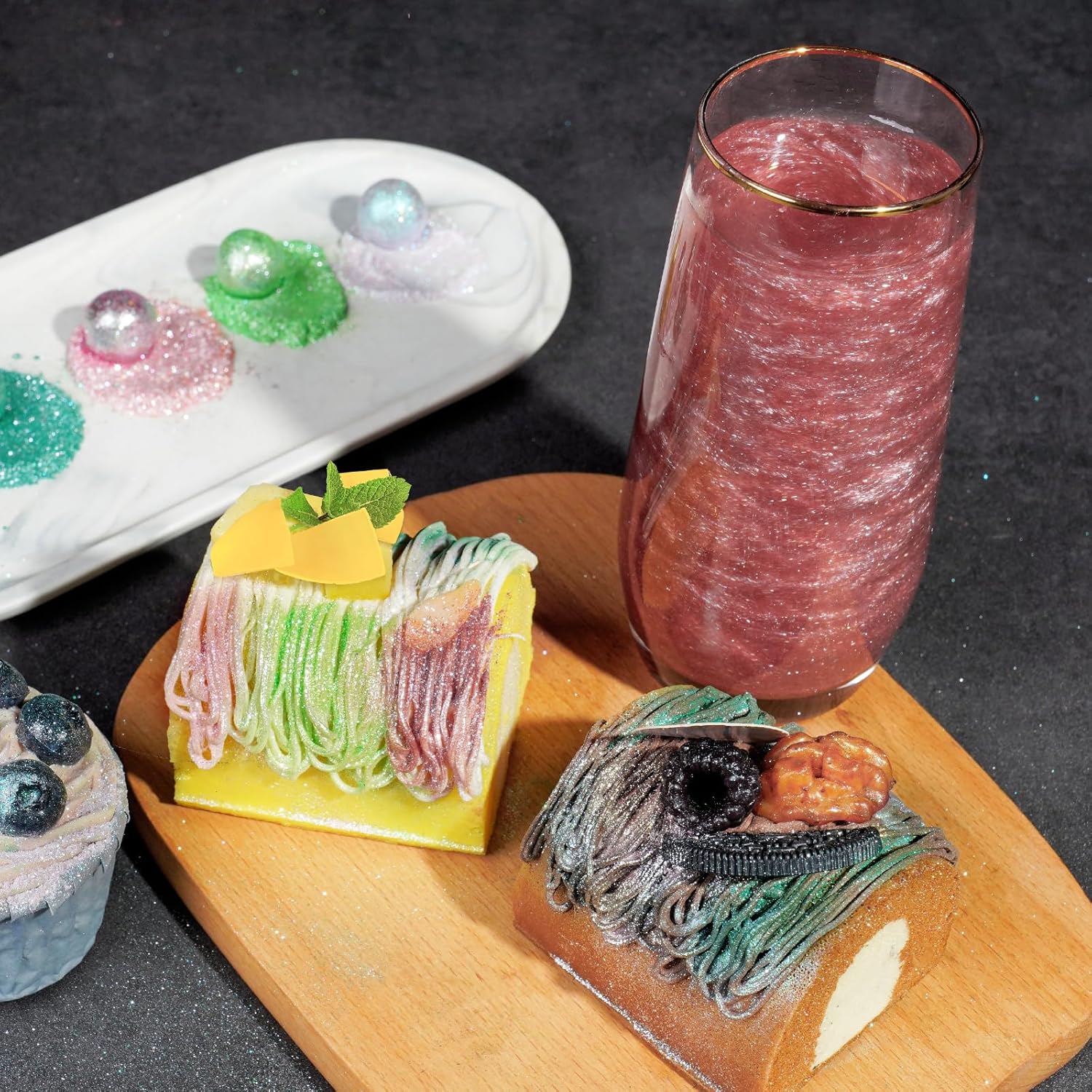 - 🌟【Easy to Use】Specially developed for food decoration and craft industries, this luster dust produces realistic looks by highly pigmented colors with a metallic finish. The pretty fine grain is more convenient for painting. To add glimmer and sparkle to your creations, simply sprinkle or dry brush the luster glitters on them. This product adheres very well to both wet and dry mediums. Attention: Seal and store glitter powder in a cool and dry place after use. Do not expose to excessive heat.