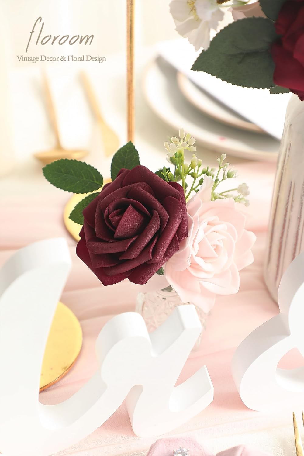 Floroom Blush Burgundy Artificial Flowers Dark Red Fake Roses Peonies Dahlia and Greenery Combo Box Set for DIY Wedding Bouquets Bridal Shower Centerpieces Floral Arrangements Party Tables Decorations