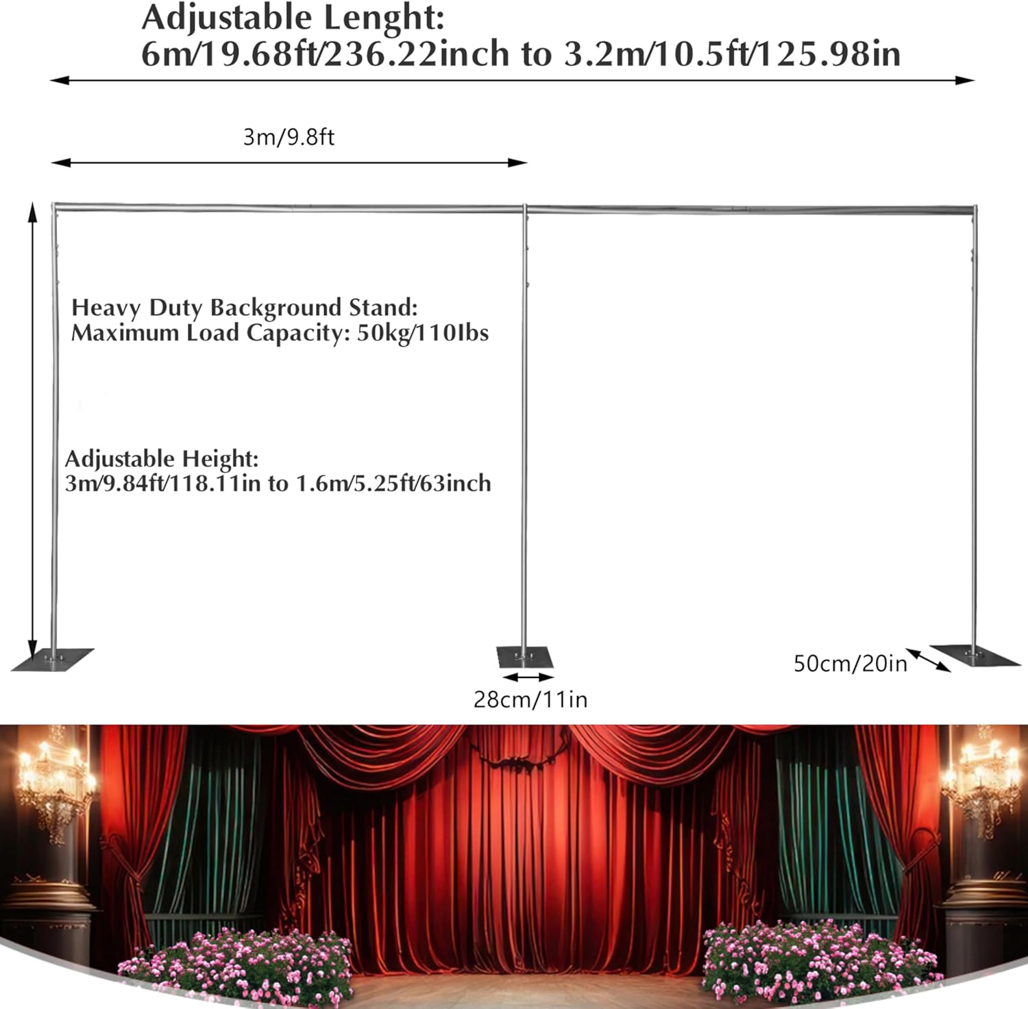 • Functional: Adjustable Telescopic (Lenght: 6m/19.68ft/236.22inch to 3.2m/10.5ft/125.98inch. Height: 3m/9.84ft/118.11in to 1.6m/ 5.25ft / 63inch). Photo studio support equipment photography background wedding party backdrop stand curtain frame stand enough to reuse in various major party event stage background decoration or photo studio photography exhibition.
