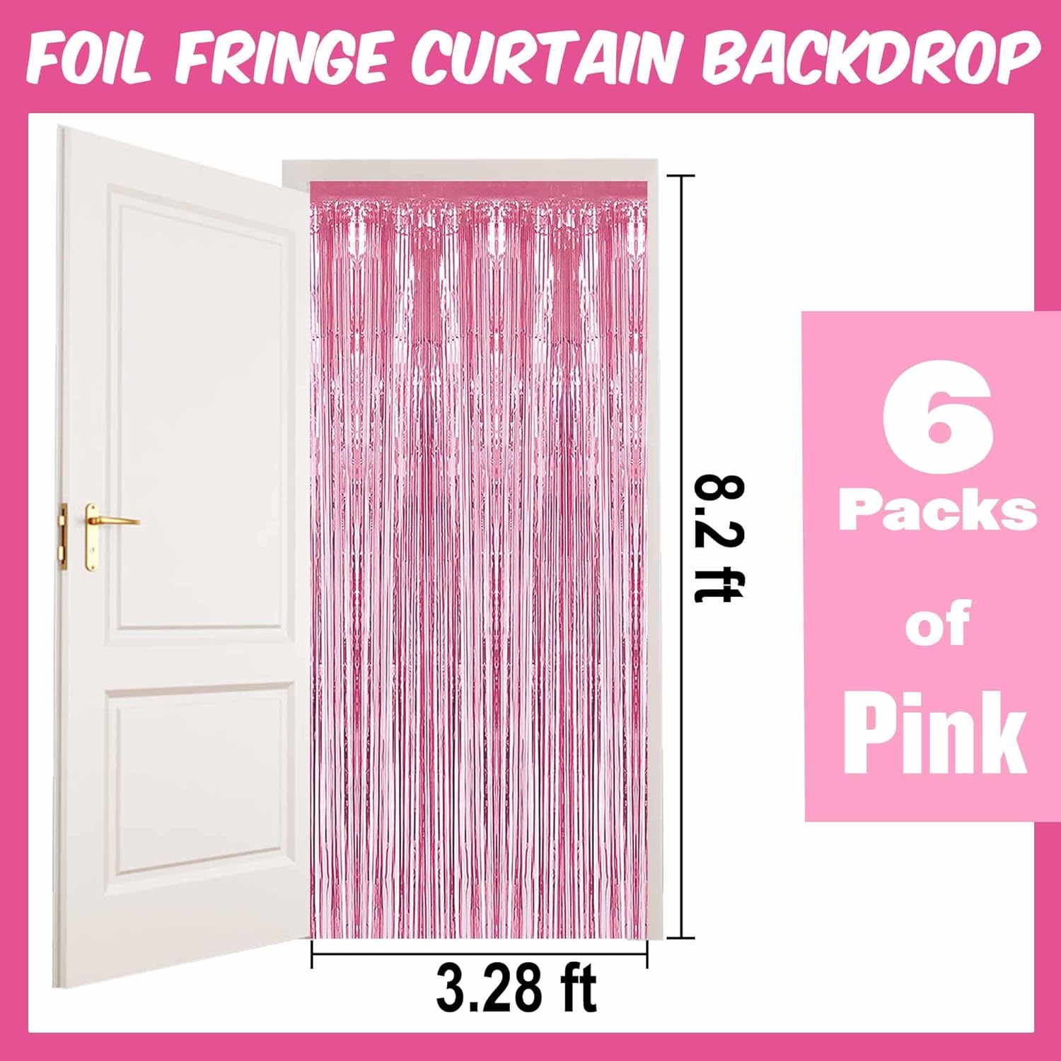 • Package and size: 6 Packs Foil Fringe Streamers Curtain Backdrop. The size is 3.28 x 8.2 feet. It's long, enough to fit any party occasion. Made of metallic foil material, shiny and creating dazzling effects, adding luxury and visual impact to the party