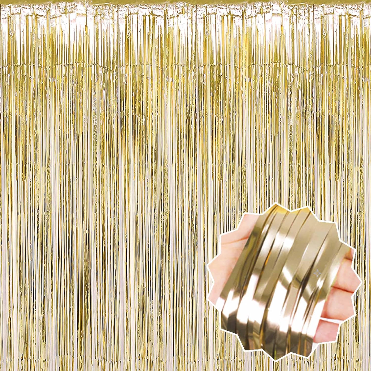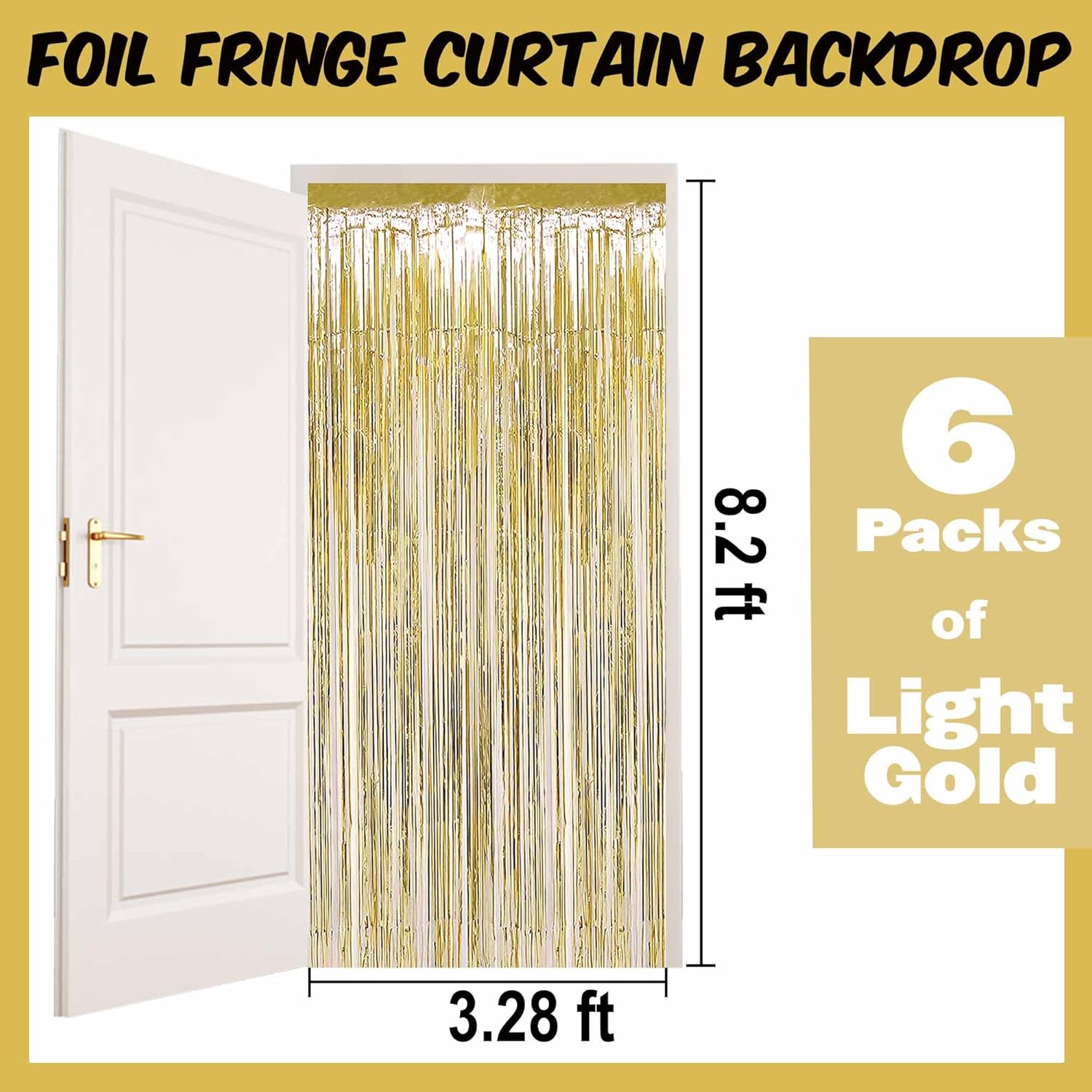 6 Pack Light Gold Foil Fringe Curtains Backdrop, 3.28 x 8.2 Ft Metallic Streamers Tinsel Curtains Background for Photo Booth, Birthday, Weddings, Carnivals, Graduation, Themed Party Decorations