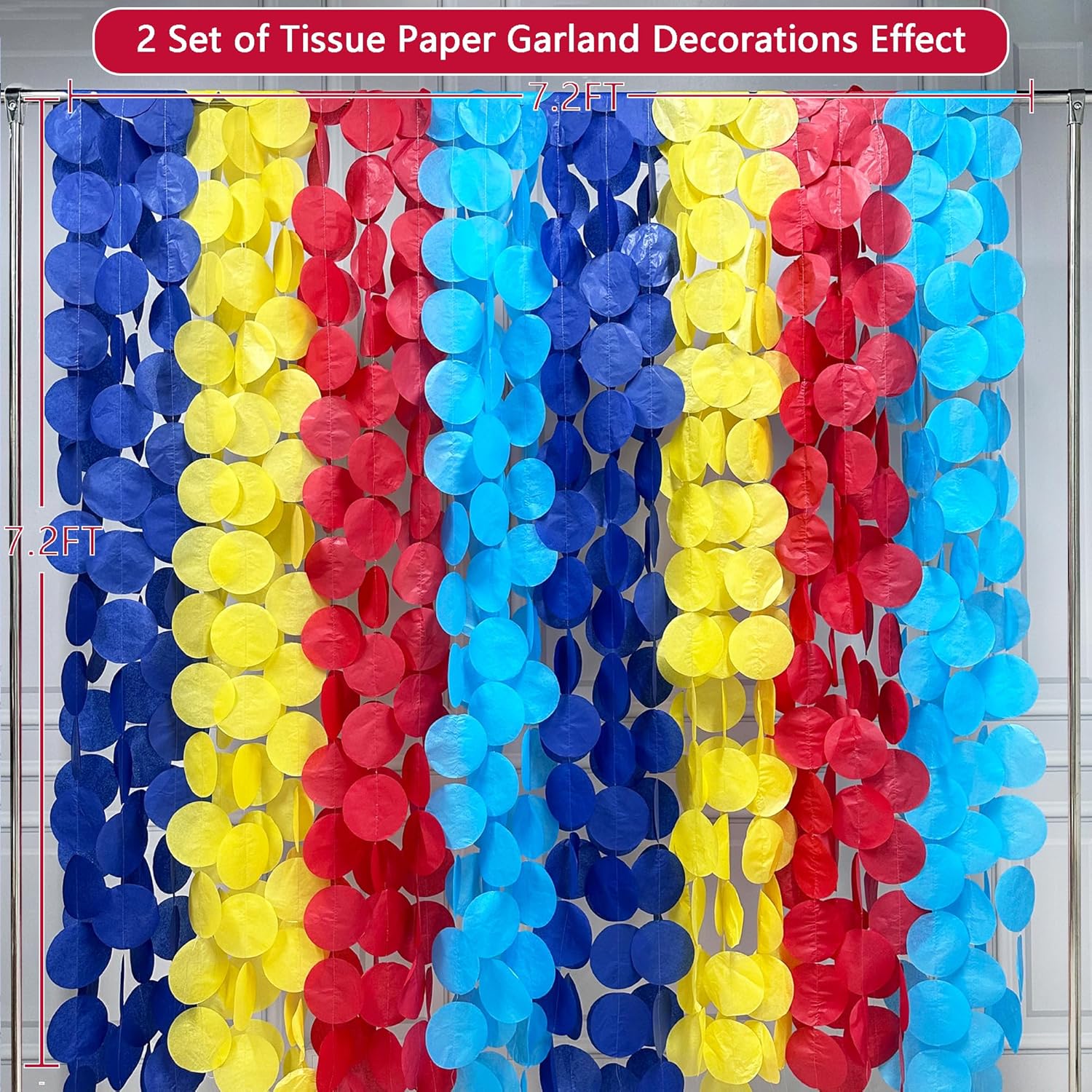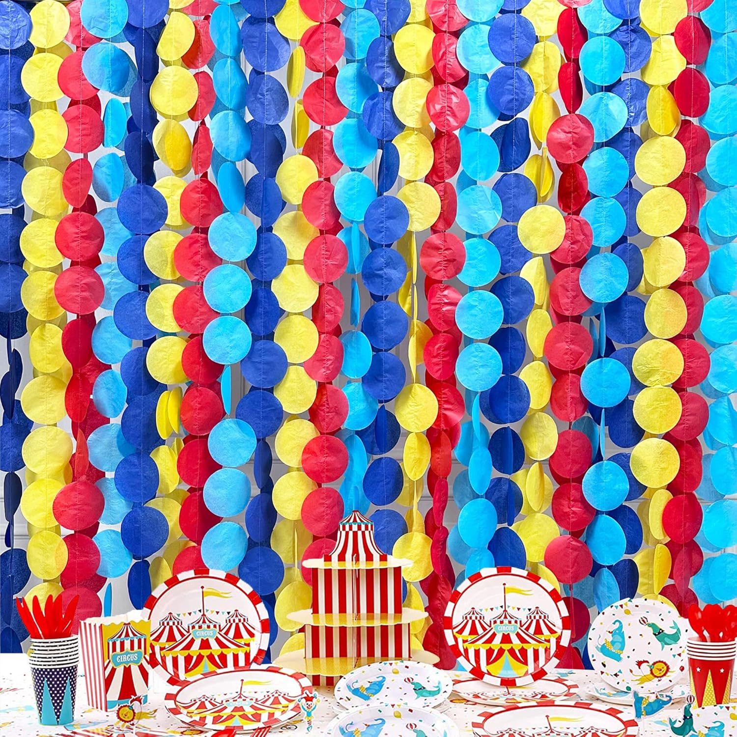 - 🔵ENVIRONMENTAL MATERIAL-Our circus clown theme big circle dot streamer garland are made of high quality tissue paper,carefully hand-made and machine-sewn together with thread.durable and reusable.Unroll & unwrap the tissue paper garland carefully. Due to delicate nature of thread, may tangle.