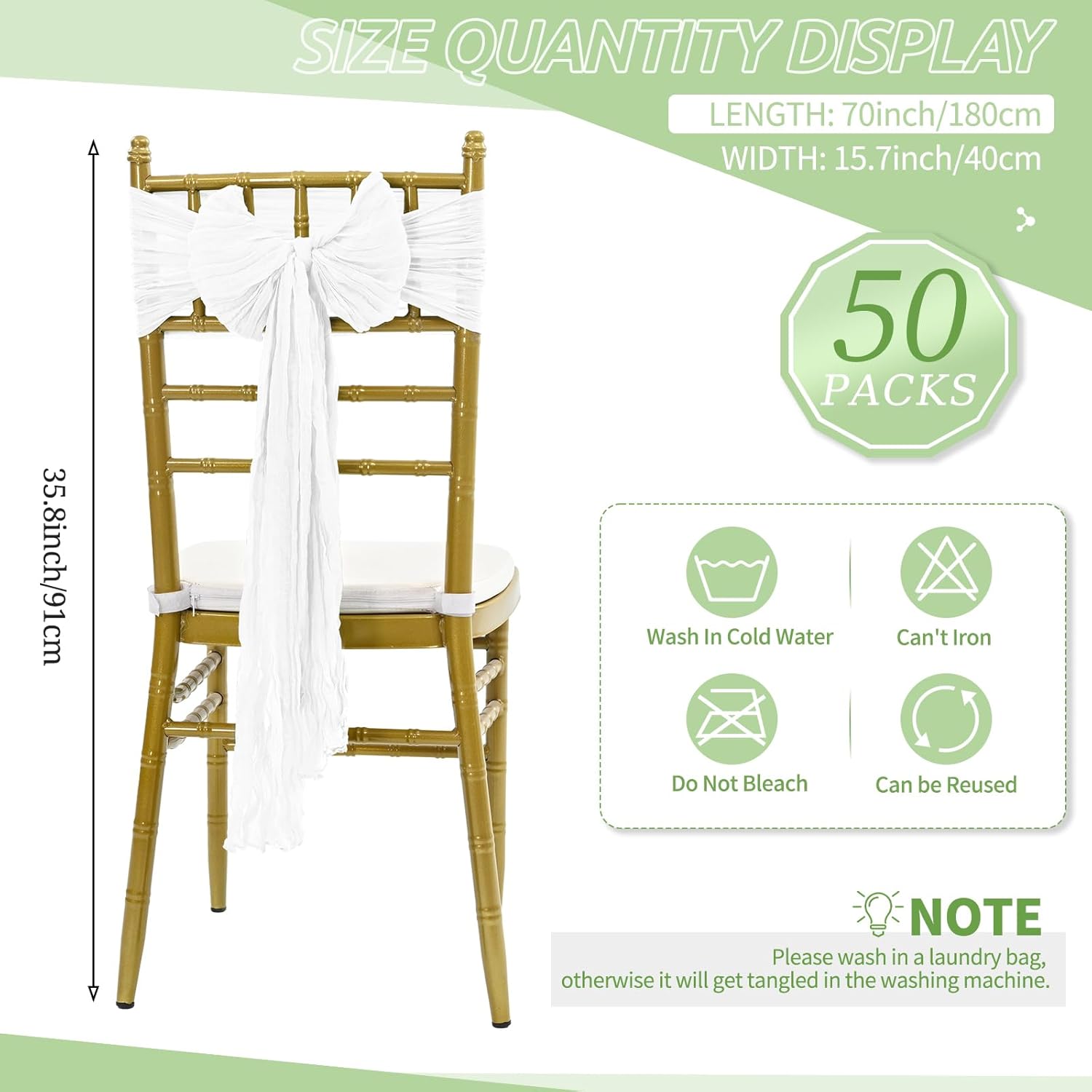 - 【Package includes】You will receive 50 pieces white cheesecloth chair sashes, nough quantity for your daily needs. and they will make your simple chairs more elegant, high-quality cheesecloth chair bows fabric beautifully transforms chairs for a stunning display that makes each guest feel regal.