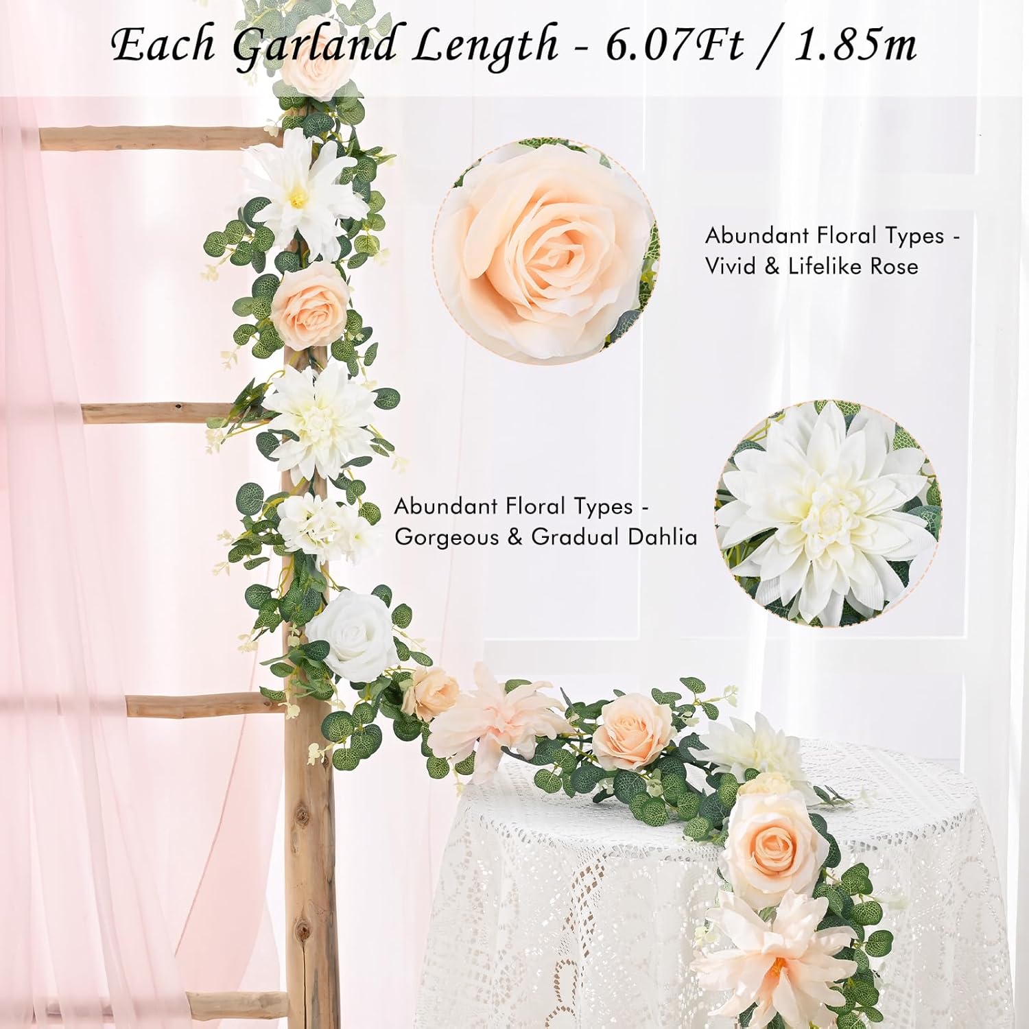 - 🤍ABUNDANT FLORAL MATCH: Indulge in the enchanting variety of our eucalyptus garland with flowers. We've handpicked romantic roses, sumptuous peonies, delicate hydrangeas and majestic dahlias to intersperse among the eucalyptus foliage. Create a different full layering and sense of romantic.