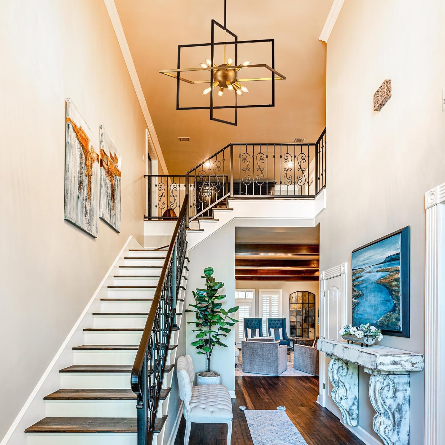 - 【Large-Scale Frame Design】The stunning combination of modern and industrial elements brings an unprecedented sense of style to your space with this awe-inspiring cubic geometric pendant light. The center of the artificial satellite chandelier features 12 golden lights surrounded by two layers of rectangular metal frames. It's perfect for living rooms, kitchen islands, dining rooms, hallways, staircases, entrances, coffee shops, and restaurants.