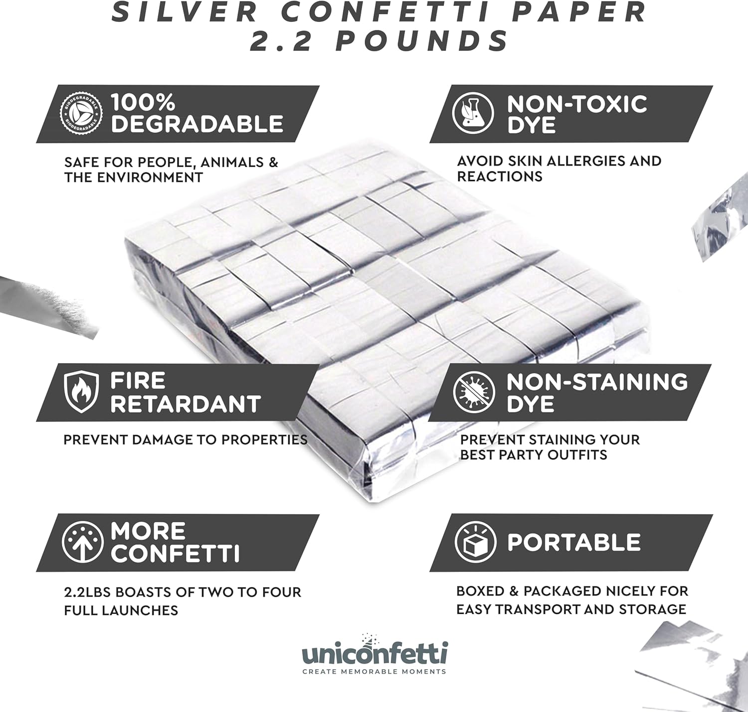 - π SILVER CONFETTI PAPER - Contains vibrant silver confetti paper that can be used with our Confetti Launcher Machine with Remote Control.