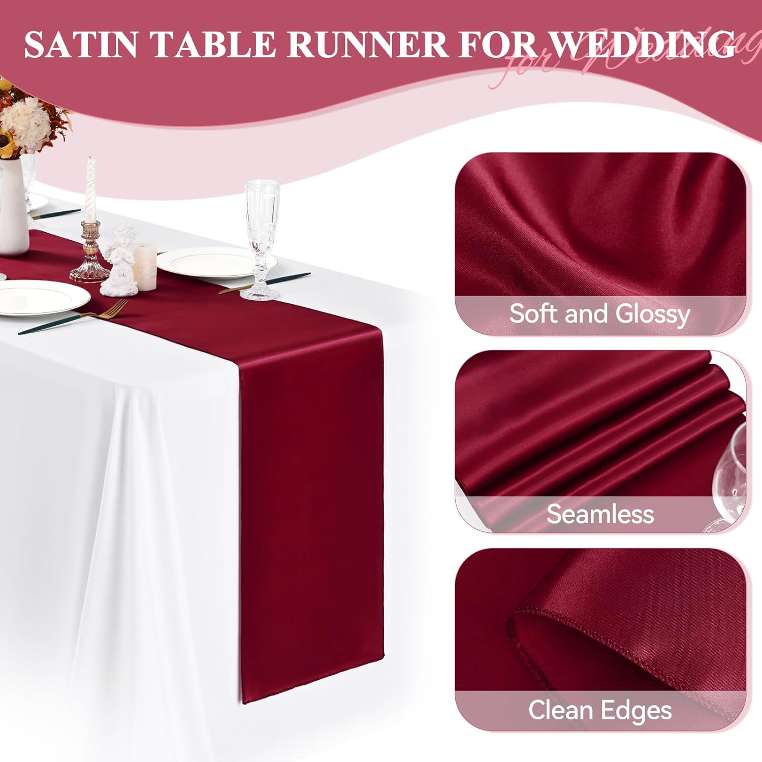 - 🍷【Set includes】20 Pack burgundy satin table runner measures 12" x 108" in size, appropriate for a table that can seat 8-10 people. This satin table runner can fit a 6ft/8ft rectangular table or round table well.This satin table runner is great for event table decorations.Our satin table runner make your dining table more dazzling and outstanding.Purchase our 20 piece satin table runner and save even more.