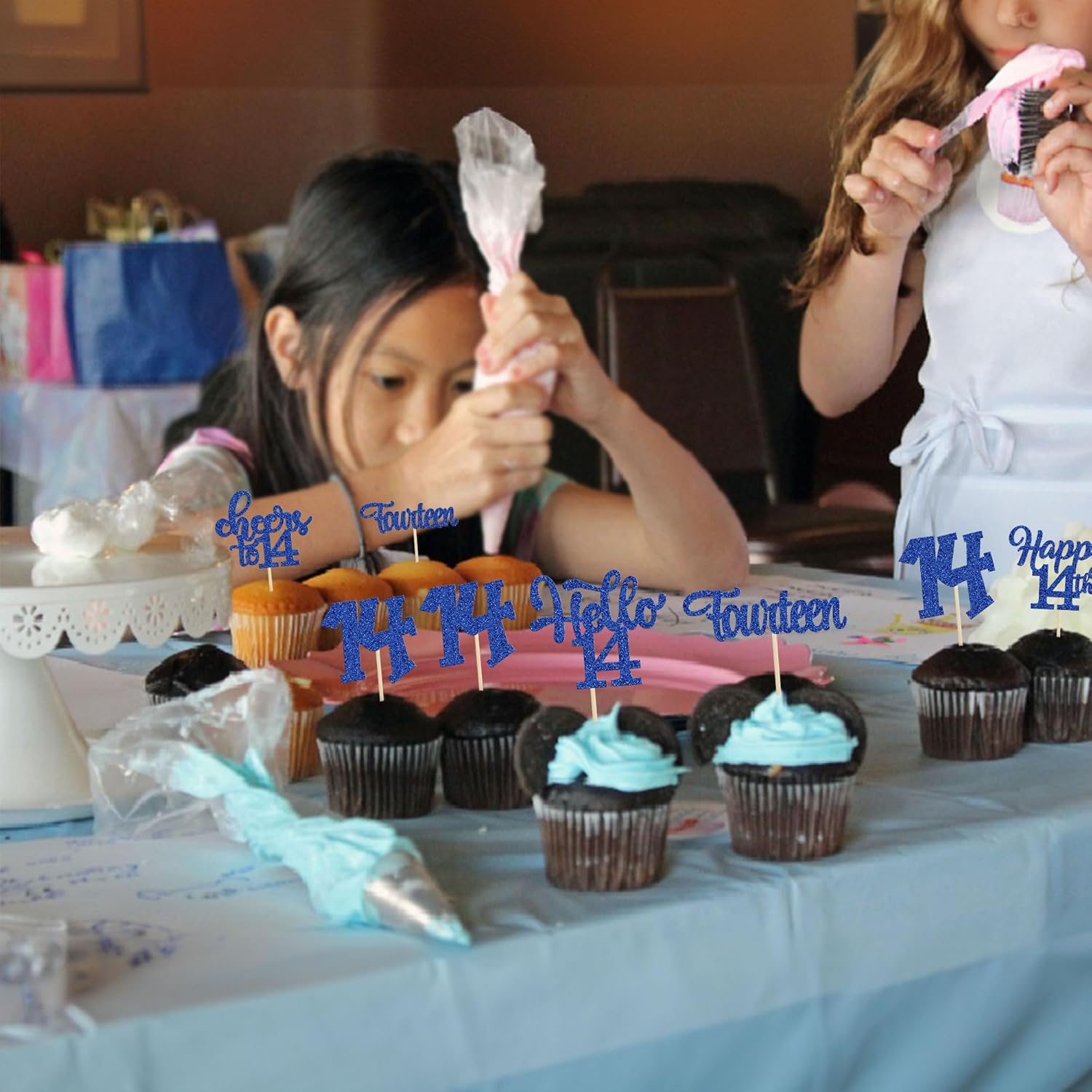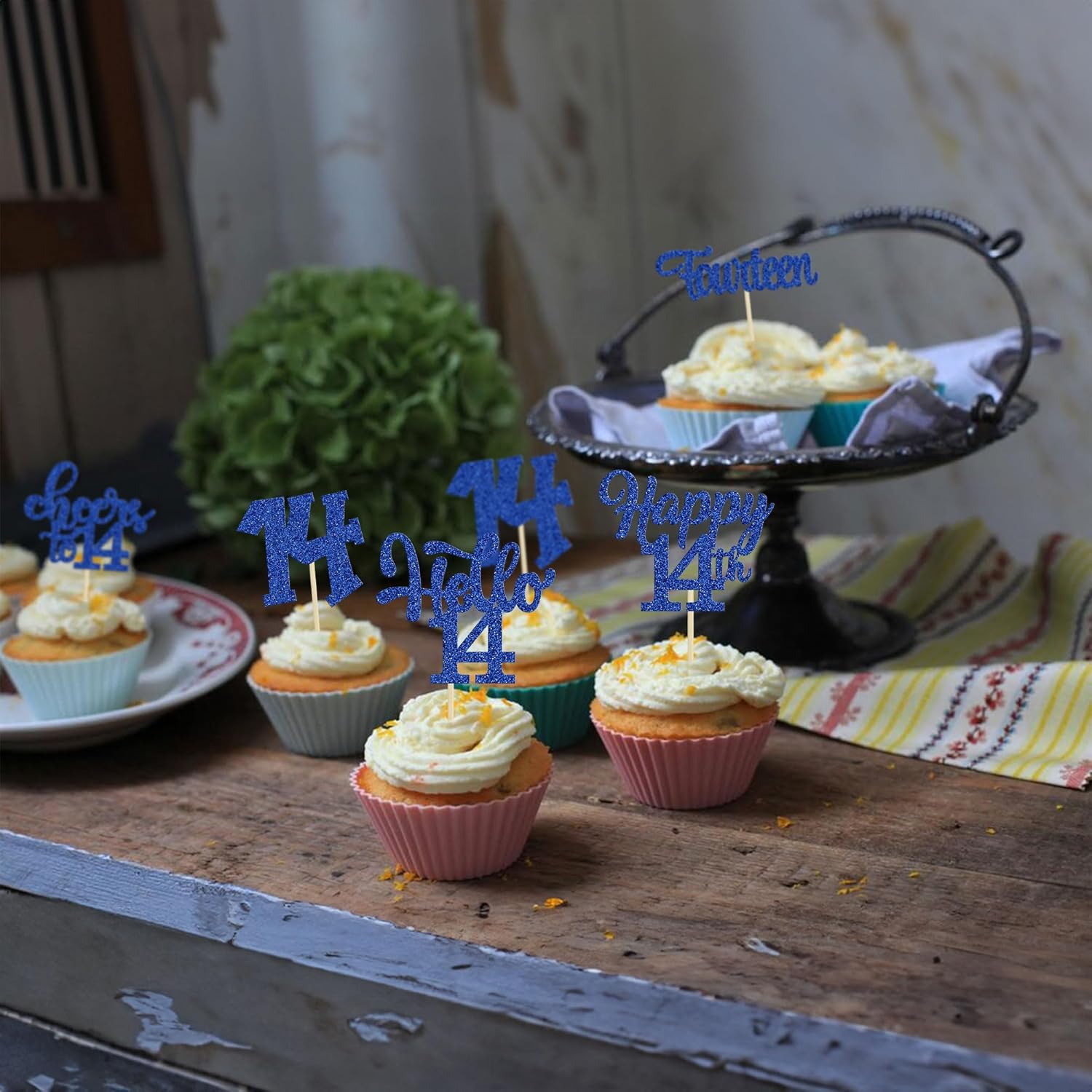 30Pcs 14th Birthday Cupcake Toppers Hello 14 Cupcake Picks Fourteen Cheers to 14 Years Old Cake Decorations for 14th Birthday Anniversary Party Supplies Deep Blue Glitter
