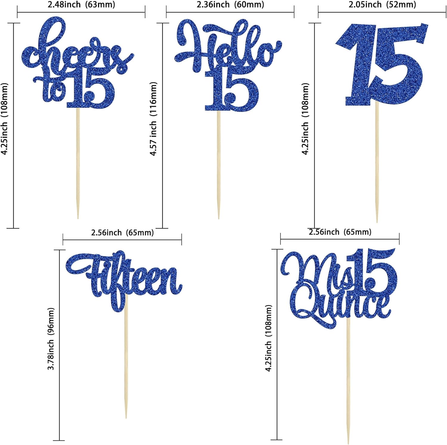 30Pcs 15th Birthday Cupcake Toppers Fifteen Cupcake Picks Cheers to 15 Years Old Mis Quince 15 Cake Decorations for 15th Birthday Anniversary Party Deep Blue Glitter