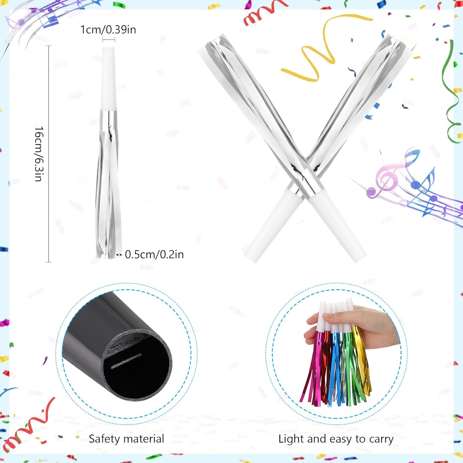 - Party favor for kids: The party noisemakers are approximately 16 cm/6.3 inches long, making them small and lightweight. They are easy to carry and store, which makes them suitable for most children to hold comfortably.