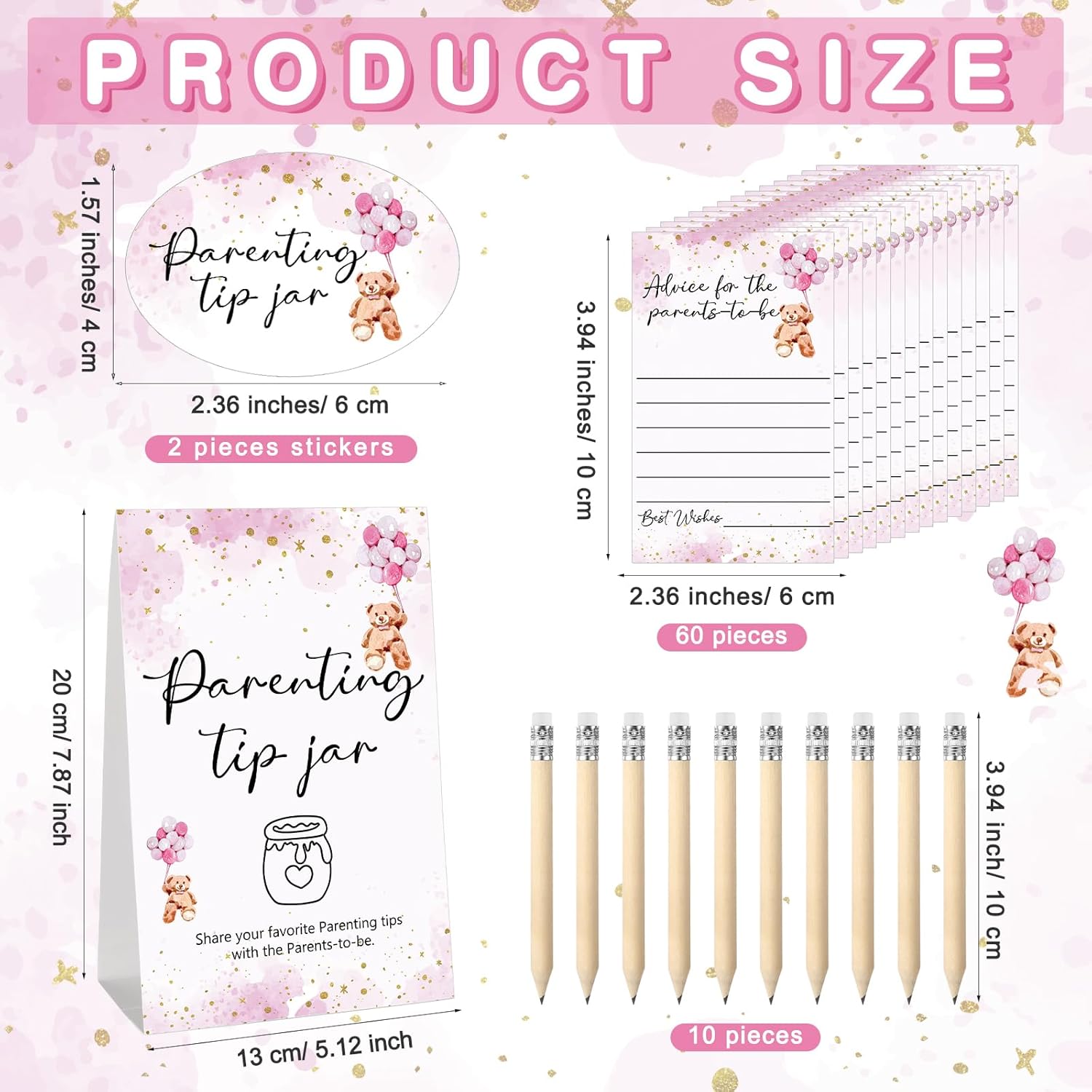 - Baby Shower Cards Set: the package contains 1 piece of parenting tip jar sign, 60 pieces of tips cards for the parents to be, 10 pieces of pencils, 2 pieces of cute stickers, and 1 PET bottle, enough quantity and delicate design to meet your use needs