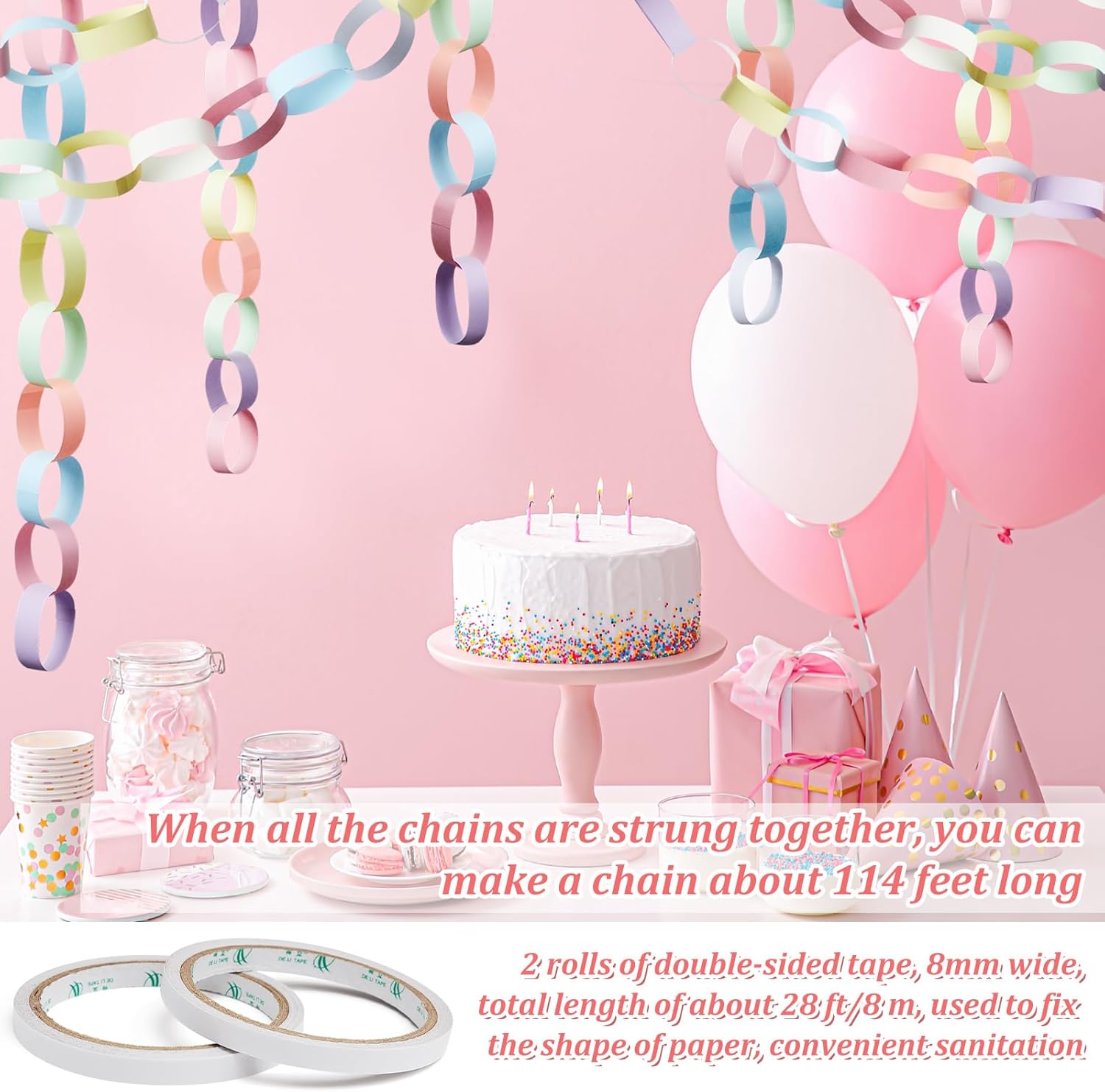 - Abundantly Colorful Paper Strips: the color palette is bountiful with our 600 sheets paper chain strips, equipped with 2 rolls of double sided tapes; The abundant quantity means you can create a paper chain that can stretch up to 28 feet in total length; The multitude of colors available broadens your design spectrum, bringing out ingenuity and creativity