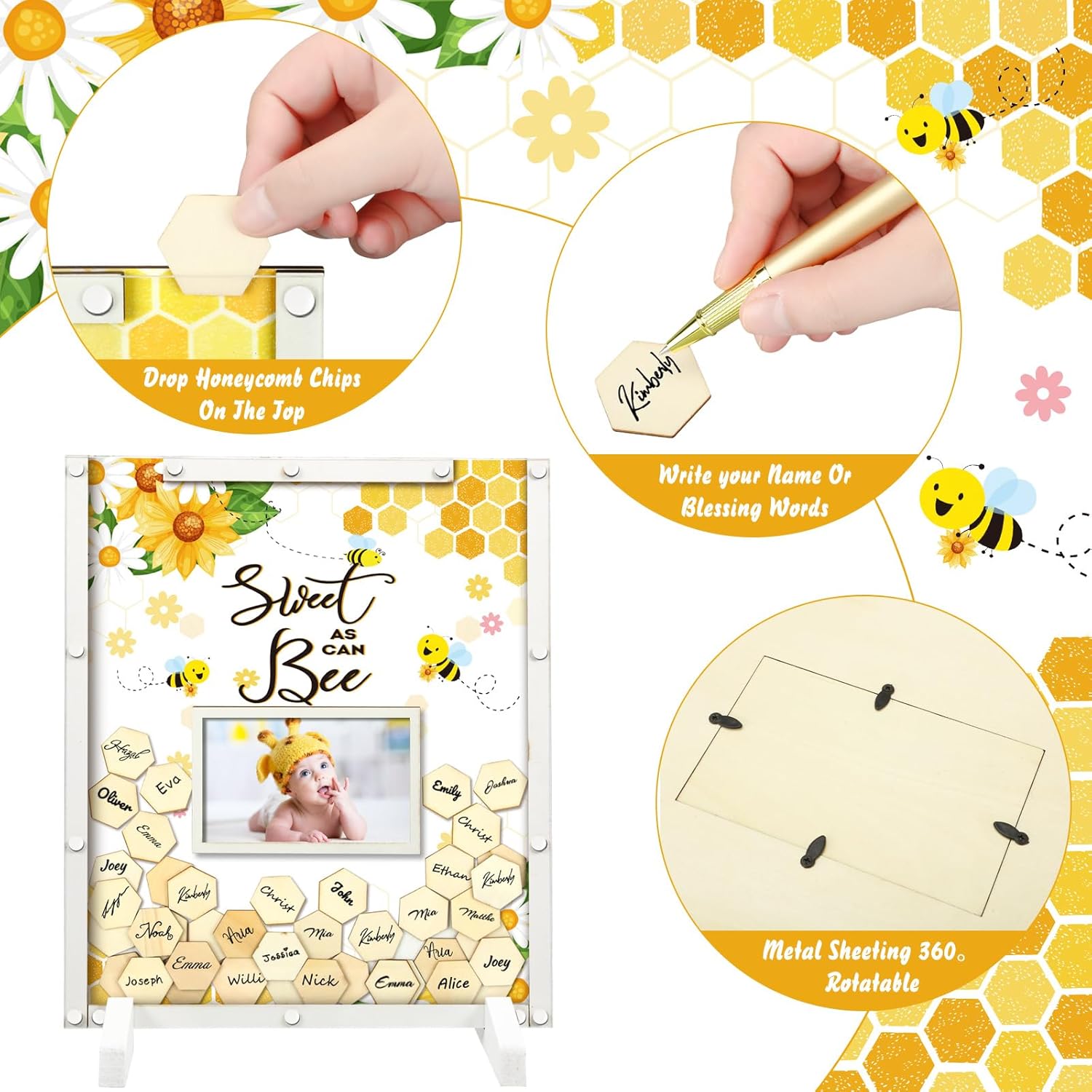 - Bee Baby Shower Decorations: you will receive a bee theme baby shower guest book with photo frame in 11.81 x 13.78 inches/ 30 x 35 cm, a pen, 60 honeycomb wood cutouts, 1 organza bag, 2 display shelves, enough to meet the needs of your bee themed baby shower party