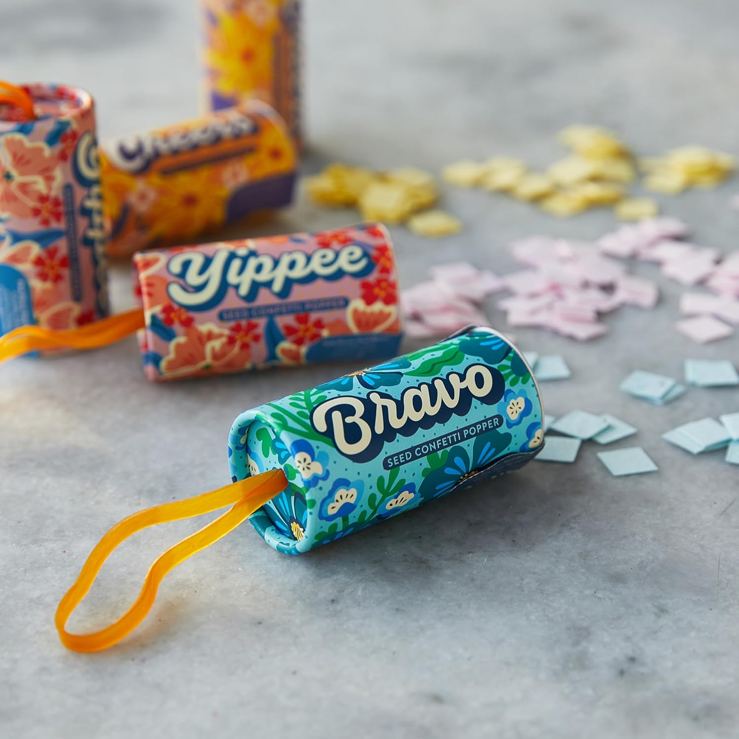 - Celebrate & Grow Flowers: Turn any celebration into a blooming memory with our confetti poppers; Each popper is filled with vibrant seed paper confetti embedded with flower seeds, creating a fun way to celebrate and a lasting way to plant; Simply remove the cap, Angle away, pull band back by 7-10" and release to pop; Pop in a location with full sun after the final frost and water regularly; The refillable popper tube design makes it easy to reuse - refills sold separately