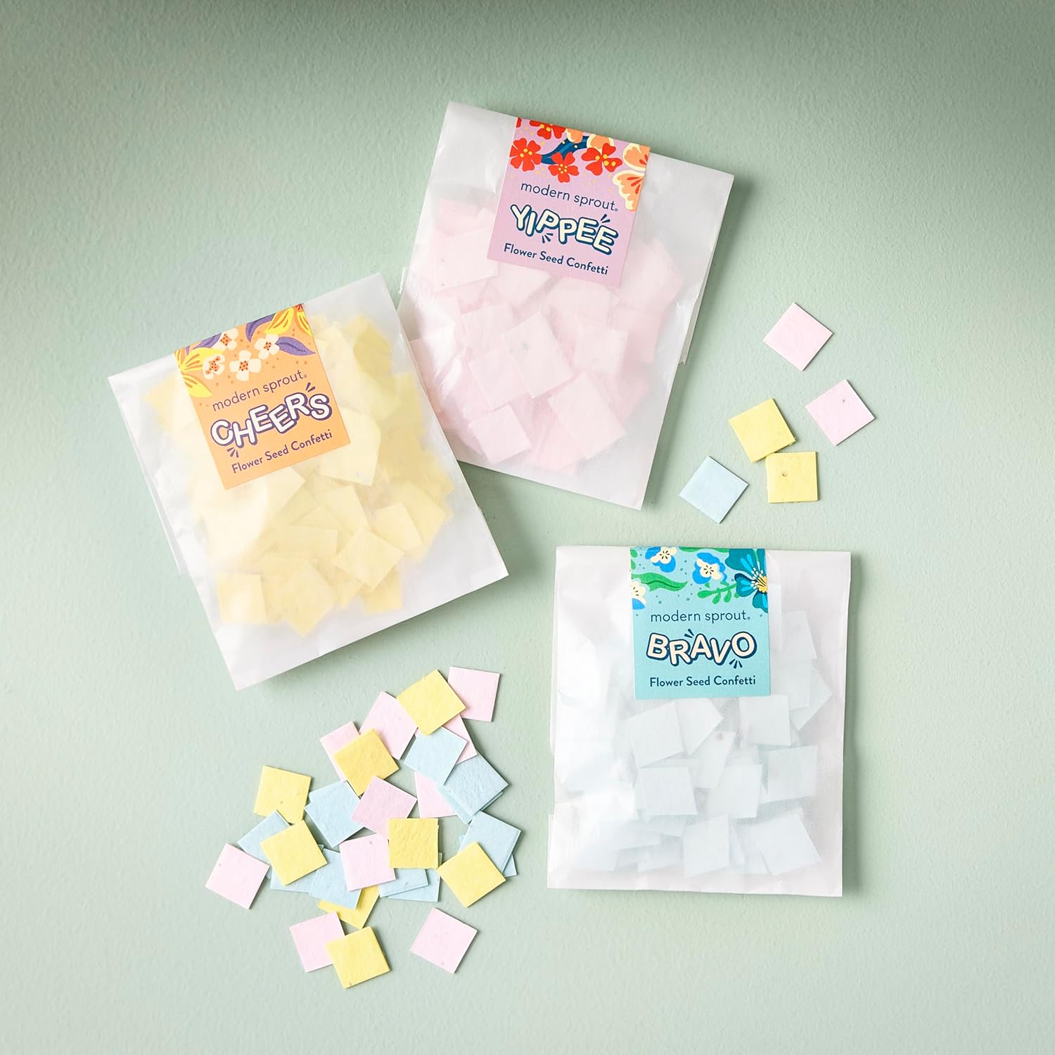 - Package Contents: Modern Sprout Seed Paper Confetti Poppers Refill Packs - Bravo – Blue Flower Seed Blend: Baby Blue Eyes, Blue Flax, Cheers – Yellow Flower Seed Blend: Alyssum, Black-Eyed Susan, Yippee – Red & Pink Flower Seed Blend: Catchfly, Clarkia (Pack of 12); 100 pcs. of Seed Paper Confetti embedded with Flower Seeds (enough to refill your Popper 4 times!)