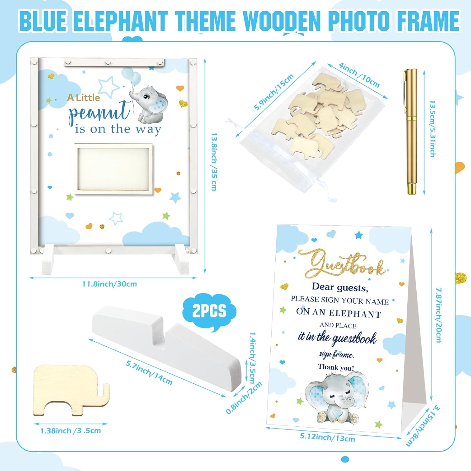 - blue elephant Baby Shower Decorations: you will receive a blue elephant theme baby shower guest book with photo frame in 11.81 x 13.78 inches/ 30 x 35 cm, a pen, 60 blue elephant wood cutouts, 1 organza bag, 2 display shelves, enough to meet the needs of your blue elephant themed baby shower party