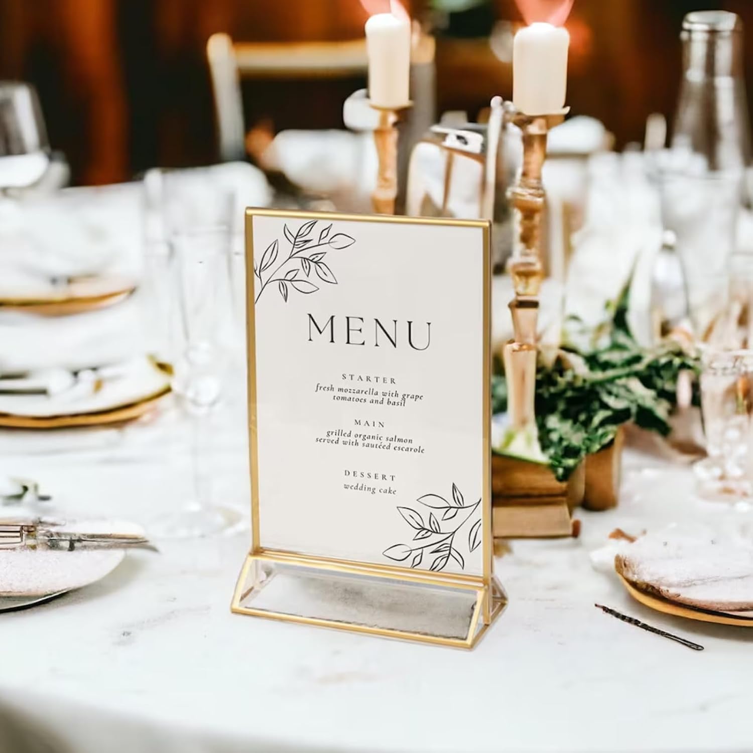 - Double Sided Acrylic Sign Holder: Our acrylic sign holder is made of 3mm thick acrylic material, sturdy and unbreakable, fully compliant with the 5 x 7 inch size standard, the acrylic sign holder is designed with gold border double-sided vertical holders, which can clearly and effectively display pictures, table numbers or wedding table signage.