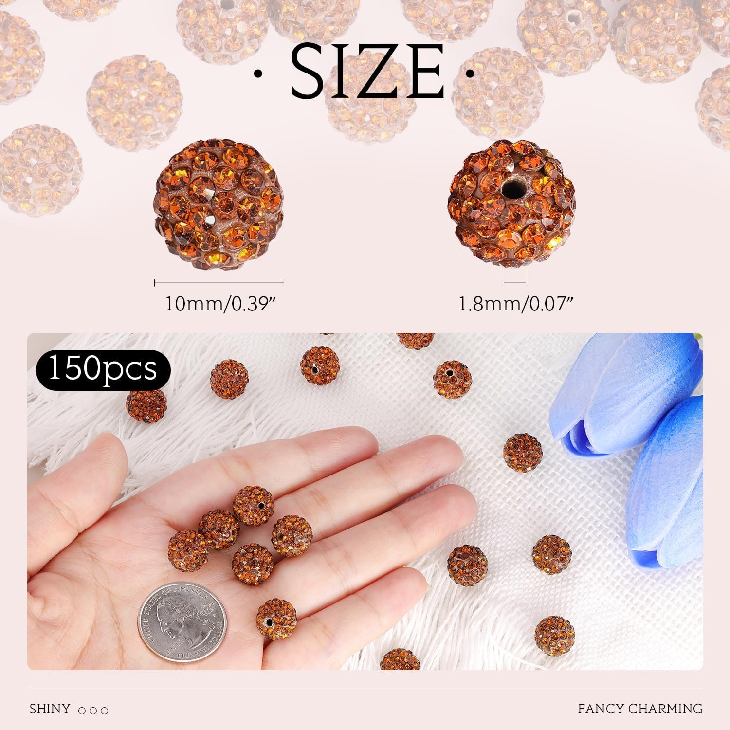 150 pcs 10mm Rhinestone Beads for Jewelry Making, Brown Shiny Round Shamballa Disco Beads Bulk, Sparkle Crystal Clay Christmas for Bracelet Baseball Necklace Earring Crafting and DIY